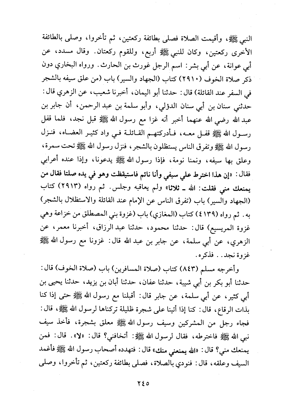 النبي - صلى الله عليه وسلم -، وأقيمت الصلاة فصلى بطائفة ركعتين، ثم تأخروا، وصلى بالطائفة الأخرى ركعتين، وكان للنبي - صلى الله عليه وسلم - أربع، وللقوم ركعتان. وقال مسدد، عن أبي عوانة، عن أبي بشر: اسم الرجل غورث بن الحارث. ورواه البخاري دون ذكر صلاة الخوف (2910) كتاب (الجهاد والسير) باب (من علق سيفه بالشجر في السفر عند القائلة) قال: حدثنا أبو اليمان، أخبرنا شعيب، عن الزهري قال: حدثني سنان بن أبي سنان الدؤلي، وأبو سلمة بن عبد الرحمن، أن جابر بن عبد الله رضي الله عنهما أخبر أنه غزا مع رسول الله - صلى الله عليه وسلم - قبل نجد، فلما قفل رسول الله - صلى الله عليه وسلم - قفل معه، فأدركتهم القائلة في واد كثير العضاه، فنزل رسول الله - صلى الله عليه وسلم - وتفرق الناس يستظلون بالشجر، فنزل رسول الله - صلى الله عليه وسلم - تحت سمرة، وعلق بها سيفه، ونمنا نومة، فإذا رسول الله - صلى الله عليه وسلم - يدعونا، وإذا عنده أعرابي فقال: "إن هذا اخترط علي سيفي وأنا نائم فاستيقظت وهو في يده صلتا فقال من يمنعك مني فقلت: الله - ثلاثا" ولم يعاقبه وجلس. ثم رواه (2913) كتاب (الجهاد والسير) باب (تفرق الناس عن الإمام عند القائلة والاستظلال بالشجر) به. ثم رواه (4139) كتاب (المغازي) باب (غزوة بني المصطلق من خزاعة وهي غزوة المريسيع) قال: حدثنا محمود، حدثنا عبد الرزاق، أخبرنا معمر، عن الزهري، عن أبي سلمة، عن جابر بن عبد الله قال: غزونا مع رسول الله - صلى الله عليه وسلم - غزوة نجد .. فذكره.