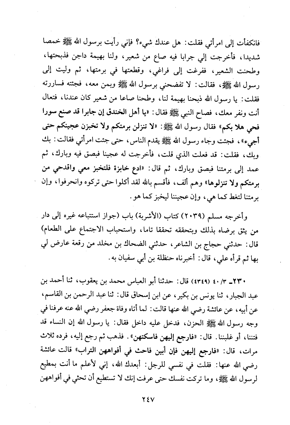 فانكفأت إلى امرأتي فقلت: هل عندك شيء؟ فإني رأيت برسول الله - صلى الله عليه وسلم - خمصا شديدا، فأخرجت إلي جرابا فيه صاع من شعير، ولنا بهيمة داجن فذبحتها، وطحنت الشعير، ففرغت إلى فراغي، وقطعتها في برمتها، ثم وليت إلى رسول الله - صلى الله عليه وسلم -، فقالت: لا تفضحني برسول الله - صلى الله عليه وسلم - وبمن معه، فجئته فساررته فقلت: يا رسول الله ذبحنا بهيمة لنا، وطحنا صاعا من شعير كان عندنا، فتعال أنت ونفر معك، فصاح النبي - صلى الله عليه وسلم - فقال: "يا أهل الخندق إن جابرا قد صنع سورا فحي هلا بكم" فقال رسول الله - صلى الله عليه وسلم -: "لا تنزلن برمتكم ولا تخبزن عجينكم حتى أجيء"، فجئت وجاء رسول الله - صلى الله عليه وسلم - يقدم الناس، حتى جئت امرأتي فقالت: بك وبك، فقلت: قد فعلت الذي قلت، فأخرجت له عجينا فبصق فيه وبارك، ثم عمد إلى برمتنا فبصق وبارك، ثم قال: "ادع خابزة فلتخبز معي واقدحي من برمتكم ولا تنزلوها" وهم ألف، فأقسم بالله لقد أكلوا حتى تركوه وانحرفوا، وإن برمتنا لتغط كما هي، وإن عجيننا ليخبز كما هو.