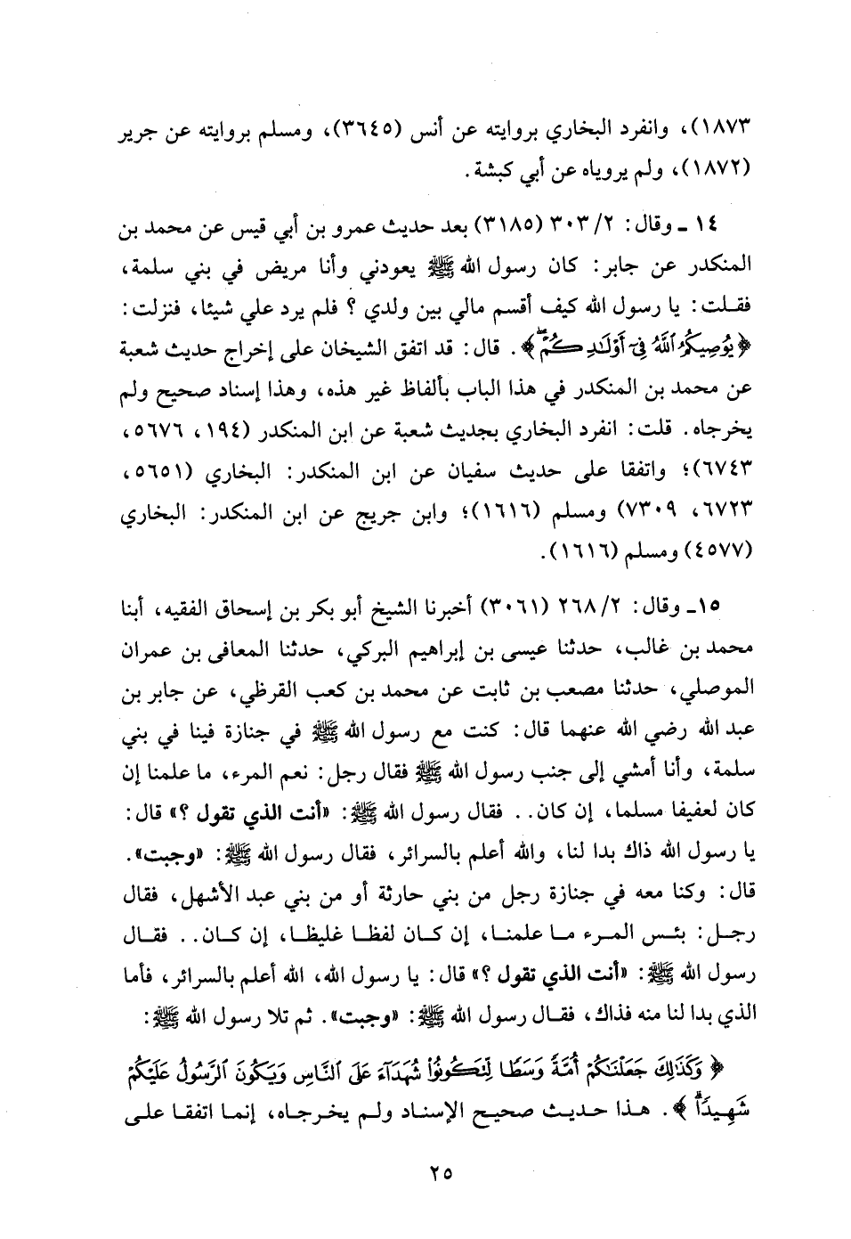 14 - وقال: 2/ 303 (3185) بعد حديث عمرو بن أبي قيس عن محمَّد بن المنكدر عن جابر: كان رسول الله - صلى الله عليه وسلم - يعودني وأنا مريض في بني سلمة، فقلت: يا رسول الله كيف أقسم مالي بين ولدي؟ فلم يرد علي شيئًا، فنزلت: {يُوصِيكُمُ اللَّهُ فِي أَوْلَادِكُمْ}. قال: قد اتفق الشيخان على إخراج حديث شعبة عن محمَّد بن المنكدر في هذا الباب بألفاظ غير هذه، وهذا إسناد صحيح ولم يخرجاه. قلت: انفرد البخاري بحديث شعبة عن ابن المنكدر (194، 5676، 6743)؛ واتفقا على حديث سفيان عن ابن المنكدر: البخاري (5651، 6723، 7309) ومسلم (1616)؛ وابن جريج عن ابن المنكدر: البخاري (4577) ومسلم (1616).