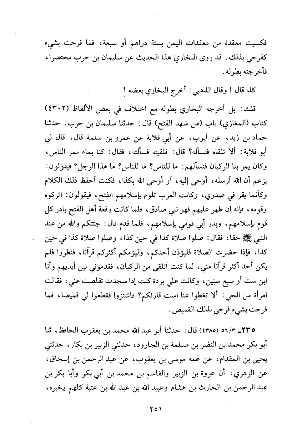 قلت: بل أخرجه البخاري بطوله مع اختلاف في بعض الألفاظ (4302) كتاب (المغازي) باب (من شهد الفتح) قال: حدثنا سليمان بن حرب، حدثنا حماد بن زيد، عن أيوب، عن أبي قلابة عن عمرو بن سلمة قال، قال لي أبو قلابة: ألا تلقاه فتسأله؟ قال: فلقيته فسألته، فقال: كنا بماء ممر الناس، وكان يمر بنا الركبان فنسألهم: ما للناس؟ ما للناس؟ ما هذا الرجل؟ فيقولون: يزعم أن الله أرسله، أوحى إليه، أو أوحى الله بكذا، فكنت أحفظ ذلك الكلام وكأنما يقر في صدري، وكانت العرب تلوم بإسلامهم الفتح، فيقولون: اتركوه وقومه، فإنه إن ظهر عليهم فهو نبي صادق، فلما كانت وقعة أهل الفتح بادر كل قوم بإسلامهم، وبدر أبي قومي بإسلامهم، فلما قدم قال: جئتكم والله من عند النبي - صلى الله عليه وسلم - حقا، فقال: صلوا صلاة كذا في حين كذا، وصلوا صلاة كذا في حين كذا، فإذا حضرت الصلاة فليؤذن أحدكم، وليؤمكم أكثركم قرآنا، فنظروا فلم يكن أحد أكثر قرآنا مني، لما كنت أتلقى من الركبان، فقدموني بين أيديهم وأنا ابن ست أو سبع سنين، وكانت علي بردة كنت إذا سجدت تقلصت عني، فقالت امرأة من الحي: ألا تغطوا عنا است قارئكم؟ فاشتزوا فقطعوا لي قميصا، فما فرحت بشيء فرحي بذلك القميص.