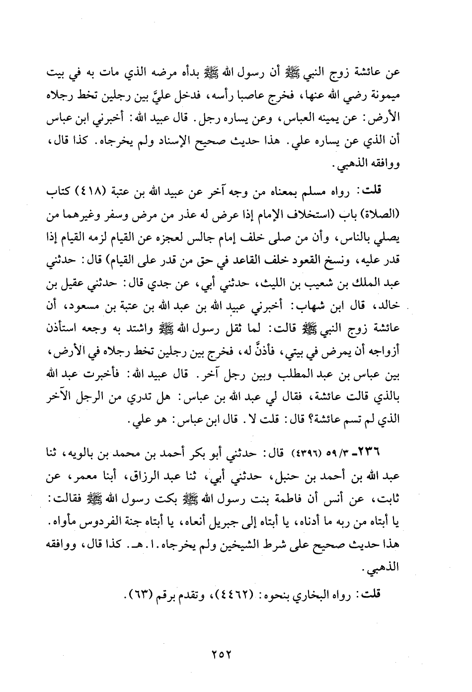 عن عائشة زوج النبي - صلى الله عليه وسلم - أن رسول الله - صلى الله عليه وسلم - بدأه مرضه الذي مات به في بيت ميمونة رضي الله عنها، فخرج عاصبا رأسه، فدخل عليَّ بين رجلين تخط رجلاه الأرض: عن يمينه العباس، وعن يساره رجل. قال عبيد الله: أخبرني ابن عباس أن الذي عن يساره علي. هذا حديث صحيح الإسناد ولم يخرجاه. كذا قال، ووافقه الذهبي.