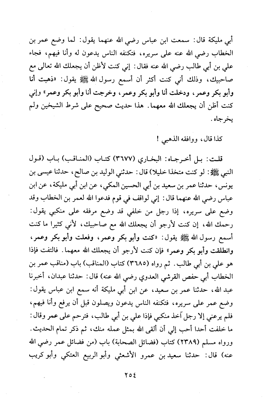 أبي مليكة قال: سمعت ابن عباس رضي الله عنهما يقول: لما وضع عمر بن الخطاب رضي الله عنه على سريره، فتكنفه الناس يدعون له وأنا فيهم، فجاء علي بن أبي طالب رضي الله عنه فقال: إني كنت لأظن أن يجعلك الله تعالى مع صاحبيك، وذلك أني كنت أكثر أن أسمع رسول الله - صلى الله عليه وسلم - يقول: "ذهبت أنا وأبو بكر وعمر، ودخلت أنا وأبو بكر وعمر، وخرجت أنا وأبو بكر وعمر" وإني كنت أظن أن يجعلك الله معهما. هذا حديث صحيح على شرط الشيخين ولم يخرجاه.
