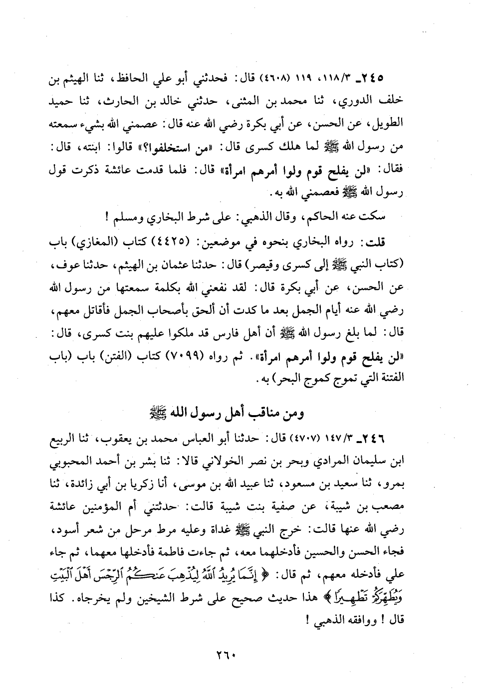 246 - 3/ 147 (4707) قال: حدثنا أبو العباس محمد بن يعقوب، ثنا الربيع ابن سليمان المرادي وبحر بن نصر الخولاني قالا: ثنا بشر بن أحمد المحبوبي بمرو، ثنا سعيد بن مسعود، ثنا عبيد الله بن موسى، أنا زكريا بن أبي زائدة، ثنا مصعب بن شيبة، عن صفية بنت شيبة قالت: حدثتني أم المؤمنين عائشة رضي الله عنها قالت: خرج النبي - صلى الله عليه وسلم - غداة وعليه مرط مرحل من شعر أسود، فجاء الحسن والحسين فأدخلهما معه، ثم جاءت فاطمة فأدخلها معهما، ثم جاء علي فأدخله معهم، ثم قال: {إِنَّمَا يُرِيدُ اللَّهُ لِيُذْهِبَ عَنْكُمُ الرِّجْسَ أَهْلَ الْبَيْتِ وَيُطَهِّرَكُمْ تَطْهِيرًا} هذا حديث صحيح على شرط الشيخين ولم يخرجاه. كذا قال! ووافقه الذهبي!