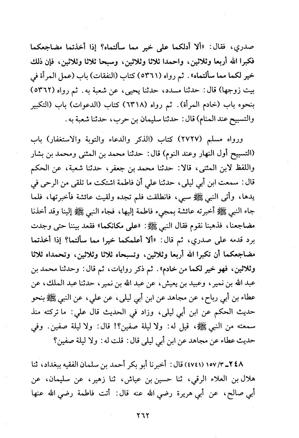 صدري، فقال: "ألا أدلكما على خير مما سألتماه؟ إذا أخذتما مضاجعكما فكبرا الله أربعا وثلاثين، واحمدا ثلاثا وثلاثين، وسبحا ثلاثا وثلاثين، فإن ذلك خير لكما مما سألتماه". ثم رواه (5361) كتاب (النفقات) باب (عمل المرأة في بيت زوجها) قال: حدثنا مسدد، حدثنا يحيى، عن شعبة به. ثم رواه (5362) بنحوه باب (خادم المرأة). ثم رواه (6318) كتاب (الدعوات) باب (التكبير والتسبيح عند المنام) قال: حدثنا سليمان بن حرب، حدثنا شعبة به.