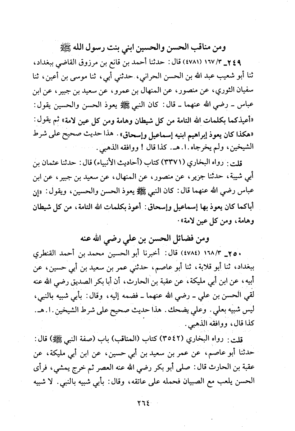 249 - 3/ 167 (4781) قال: حدثنا أحمد بن قانع بن مرزوق القاضي ببغداد، ثنا أبو شعيب عبد الله بن الحسن الحراني، حدثني أبي، ثنا موسى بن أعين، ثنا سفيان الثوري، عن منصور، عن المنهال بن عمرو، عن سعيد بن جبير، عن ابن عباس - رضي الله عنهما - قال: كان النبي - صلى الله عليه وسلم - يعوذ الحسن والحسين يقول: "أعيذكما بكلمات الله التامة من كل شيطان وهامة ومن كل عين لامة" ثم يقول: "هكذا كان يعوذ إبراهيم ابنيه إسماعيل وإسحاق". هذا حديث صحيح على شرط الشيخين، ولم يخرجاه. ا. هـ. كذا قال! ووافقه الذهبي.
