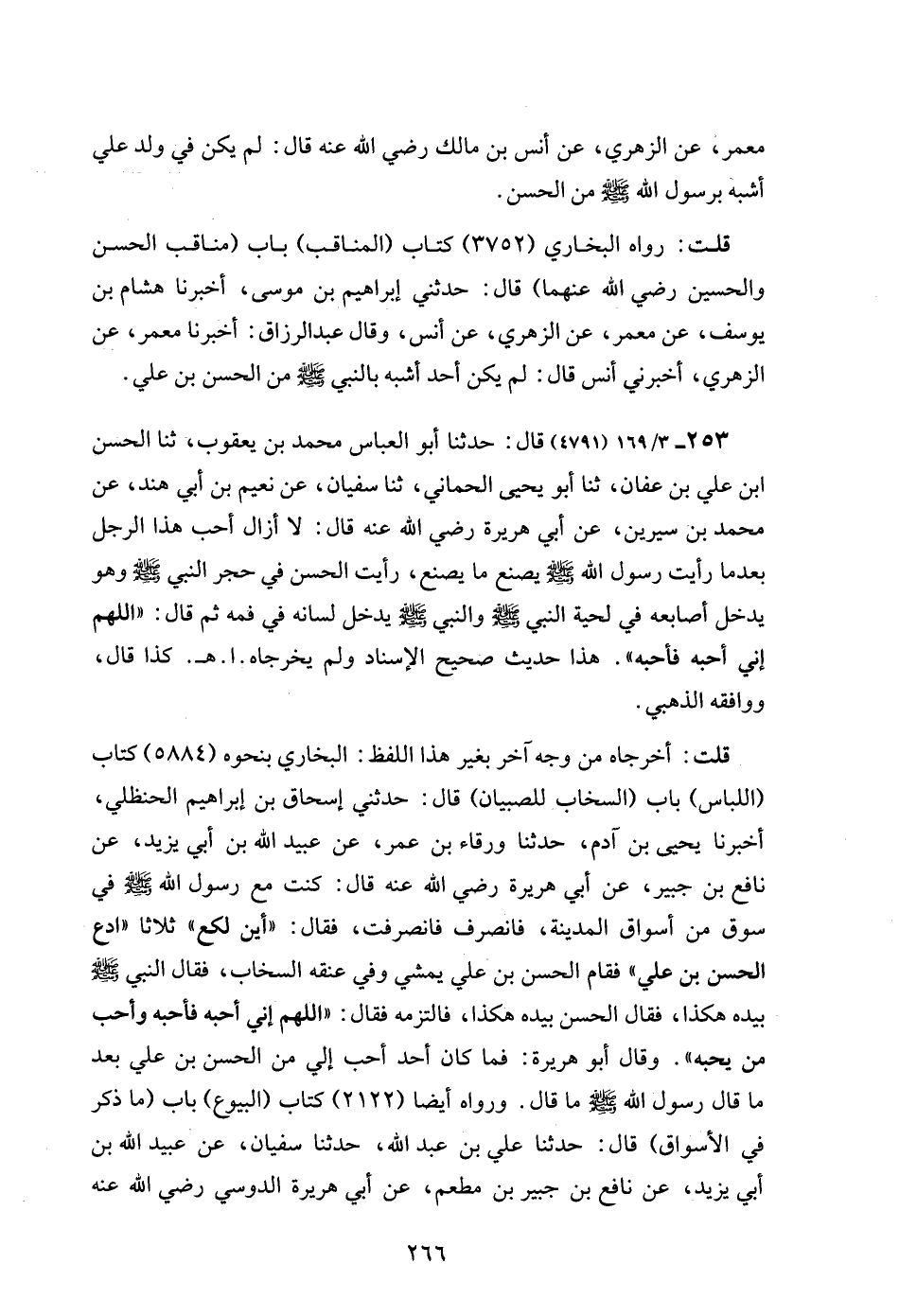253 - 3/ 169 (4791) قال: حدثنا أبو العباس محمد بن يعقوب، ثنا الحسن ابن علي بن عفان، ثنا أبو يحيى الحماني، ثنا سفيان، عن نعيم بن أبي هند، عن محمد بن سيرين، عن أبي هريرة رضي الله عنه قال: لا أزال أحب هذا الرجل بعدما رأيت رسول الله - صلى الله عليه وسلم - يصنع ما يصنع، رأيت الحسن في حجر النبي - صلى الله عليه وسلم - وهو يدخل أصابعه في لحية النبي - صلى الله عليه وسلم - والنبي - صلى الله عليه وسلم - يدخل لسانه في فمه ثم قال: "اللهم إني أحبه فأحبه". هذا حديث صحيح الإسناد ولم يخرجاه. ا. هـ. كذا قال، ووافقه الذهبي.