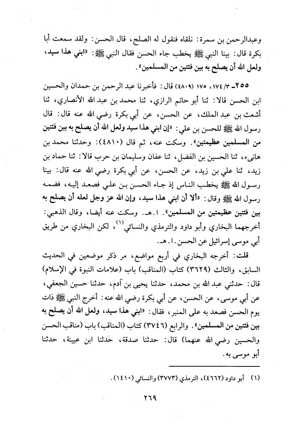 255 - 3/ 174، 175 (4809) قال: فأخبرنا عبد الرحمن بن حمدان والحسين ابن الحسن قالا: ثنا أبو حاتم الرازي، ثنا محمد بن عبد الله الأنصاري، ثنا أشعث بن عبد الملك، عن الحسن، عن أبي بكرة رضي الله عنه قال: قال رسول الله - صلى الله عليه وسلم - للحسن بن علي: "إن ابني هذا سيد ولعل الله أن يصلح به بين فئتين من المسلمين عظيمتين". وسكت عنه، ثم قال (4810): وحدثنا محمد بن هانىء، ثنا الحسين بن الفضل، ثنا عفان وسليمان بن حرب قالا: ثنا حماد بن زيد، ثنا علي بن زيد، عن الحسن، عن أبي بكرة رضي الله عنه قال: بينا رسول الله - صلى الله عليه وسلم - يخطب الناس إذ جاء الحسن بن علي فصعد إليه، فضمه رسول الله - صلى الله عليه وسلم - وقال: "ألا أن ابني هذا سيد، وإن الله عز وجل لعله أن يصلح به بين فئتين عظيمتين من المسلمين". ا. هـ. وسكت عنه أيضا، وقال الذهبي: أخرجهما البخاري وأبو داود والترمذي والنسائي (¬1)، لكن البخاري من طريق أبي موسى إسرائيل عن الحسن. ا. هـ.