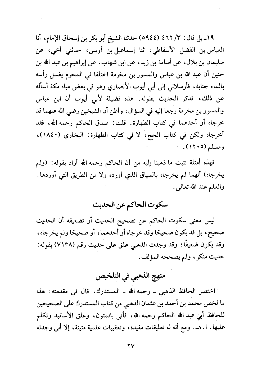 19 - بل قال: 3/ 462 (5944) حدثنا الشيخ أبو بكر بن إسحاق الإِمام، أنا العباس بن الفضل الأسفاطي، ثنا إسماعيل بن أويس، حدثني أخي، عن سليمان بن بلال، عن أسامة بن زيد، عن ابن شهاب، عن إبراهيم بن عبد الله بن حنين أن عبد الله بن عباس والمسور بن مخرمة اختلفا في المحرم يغسل رأسه بالماء جنابة، فأرسلاني إلى أبي أيوب الأنصاري وهو في بعض مياه مكة أسأله عن ذلك، فذكر الحديث بطوله. هذه فضيلة لأبي أيوب أن ابن عباس والمسور بن مخرمة رجعا إليه في السؤال، وأظن أن الشيخين رضي الله عنهما قد خرجاه أو أحدهما في كتاب الطهارة. قلت: صدق الحاكم رحمه الله، فقد أخرجاه ولكن في كتاب الحج، لا في كتاب الطهارة: البخاري (1840)، ومسلم (1205).