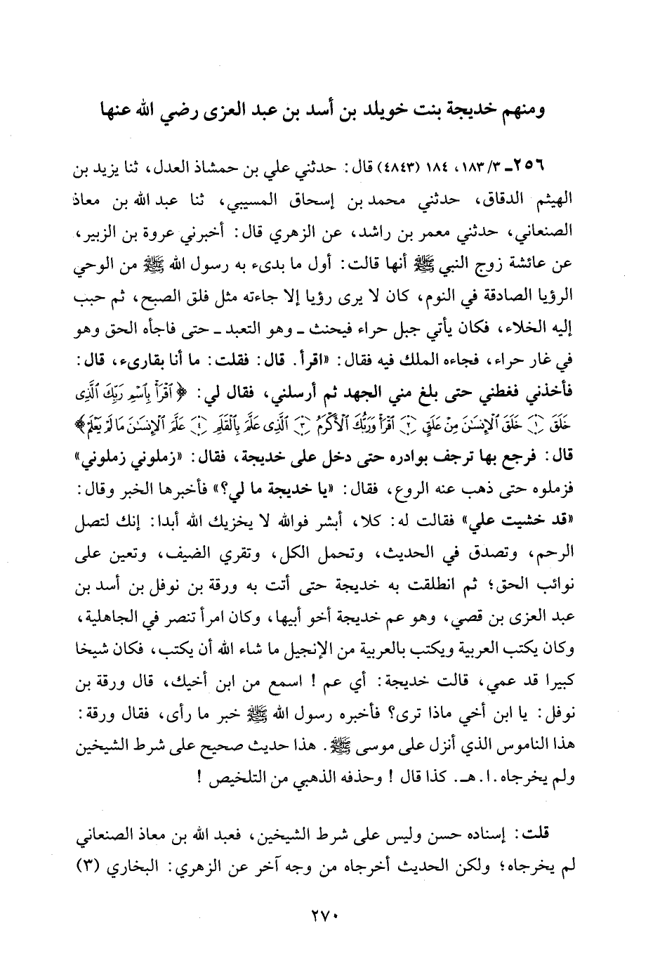 256 - 3/ 183، 184 (4843) قال: حدثني علي بن حمشاذ العدل، ثنا يزيد بن الهيثم الدقاق، حدثني محمد بن إسحاق المسيبي، ثنا عبد الله بن معاذ الصنعاني، حدثني معمر بن راشد، عن الزهري قال: أخبرني عروة بن الزبير، عن عائشة زوج النبي - صلى الله عليه وسلم - أنها قالت: أول ما بدىء به رسول الله - صلى الله عليه وسلم - من الوحي الرؤيا الصادقة في النوم، كان لا يرى رؤيا إلا جاءته مثل فلق الصبح، ثم حبب إليه الخلاء، فكان يأتي جبل حراء فيحنث - وهو التعبد - حتى فاجأه الحق وهو في غار حراء، فجاءه الملك فيه فقال: "اقرأ. قال: فقلت: ما أنا بقارىء، قال: فأخذني فغطني حتى بلغ مني الجهد ثم أرسلني، فقال لي: {اقْرَأْ بِاسْمِ رَبِّكَ الَّذِي خَلَقَ (1) خَلَقَ الْإِنْسَانَ مِنْ عَلَقٍ (2) اقْرَأْ وَرَبُّكَ الْأَكْرَمُ (3) الَّذِي عَلَّمَ بِالْقَلَمِ (4) عَلَّمَ الْإِنْسَانَ مَا لَمْ يَعْلَمْ} قال: فرجع بها ترجف بوادره حتى دخل على خديجة، فقال: "زملوني زملوني" فزملوه حتى ذهب عنه الروع، فقال: "يا خديجة ما لي؟ " فأخبرها الخبر وقال: "قد خشيت علي" فقالت له: كلا، أبشر فوالله لا يخزيك الله أبدا: إنك لتصل الرحم، وتصدق في الحديث، وتحمل الكل، وتقري الضيف، وتعين على نوائب الحق؛ ثم انطلقت به خديجة حتى أتت به ورقة بن نوفل بن أسد بن عبد العزى بن قصي، وهو عم خديجة أخو أبيها، وكان امرأ تنصر في الجاهلية، وكان يكتب العربية ويكتب بالعربية من الإنجيل ما شاء الله أن يكتب، فكان شيخا كبيرا قد عمي، قالت خديجة: أي عم! اسمع من ابن أخيك، قال ورقة بن نوفل: يا ابن أخي ماذا ترى؟ فأخبره رسول الله - صلى الله عليه وسلم - خبر ما رأى، فقال ورقة: هذا الناموس الذي أنزل على موسى - صلى الله عليه وسلم -. هذا حديث صحيح على شرط الشيخين ولم يخرجاه. ا. هـ. كذا قال! وحذفه الذهبي من التلخيص!
