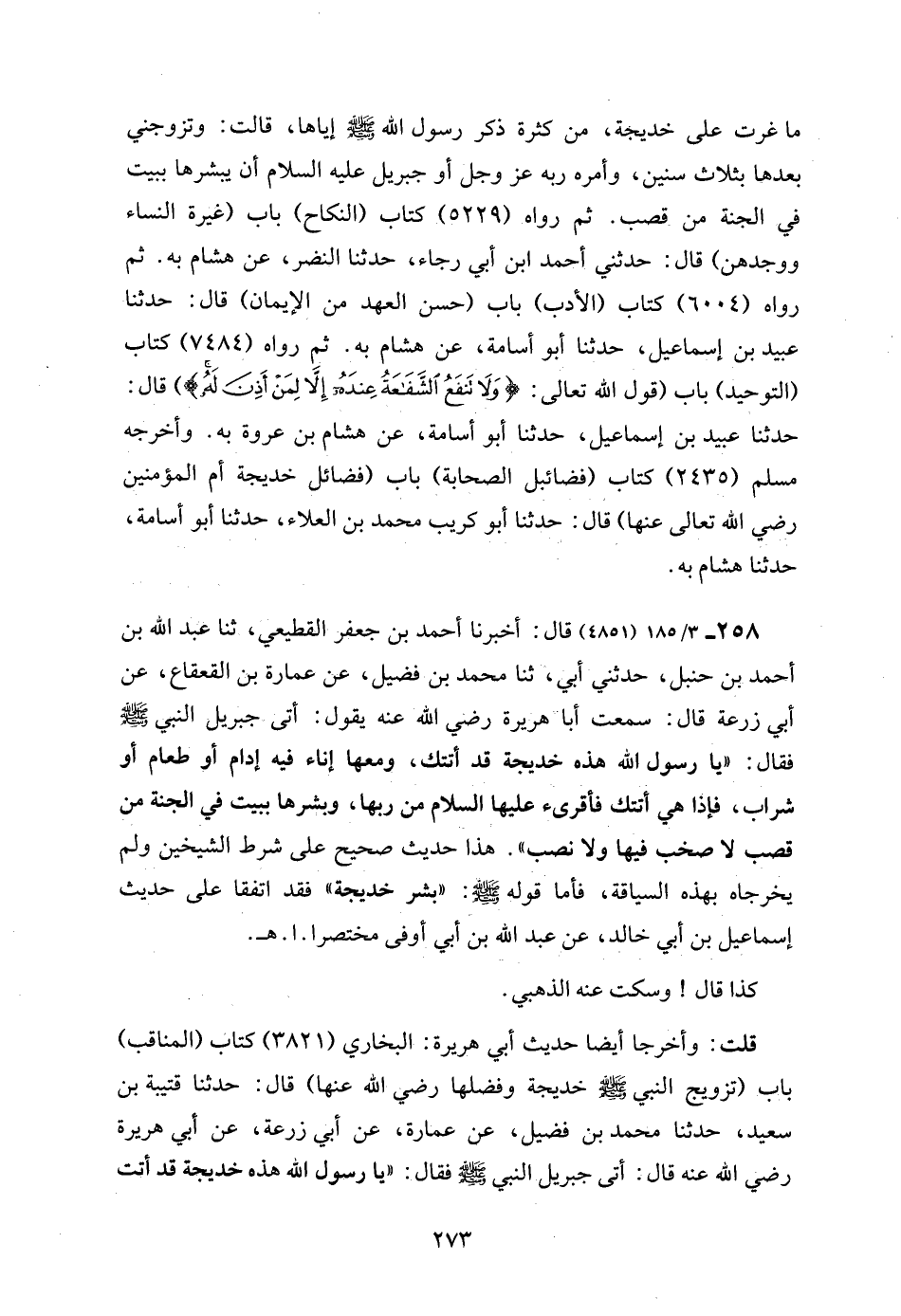 258 - 3/ 185 (4851) قال: أخبرنا أحمد بن جعفر القطيعي، ثنا عبد الله بن أحمد بن حنبل، حدثني أبي، ثنا محمد بن فضيل، عن عمارة بن القعقاع، عن أبي زرعة قال: سمعت أبا هريرة رضي الله عنه يقول: أتى جبريل النبي - صلى الله عليه وسلم - فقال: "يا رسول الله هذه خديجة قد أتتك، ومعها إناء فيه إدام أو طعام أو شراب، فإذا هي أتتك فأقرىء عليها السلام من ربها، وبشرها ببيت في الجنة من قصب لا صخب فيها ولا نصب". هذا حديث صحيح على شرط الشيخين ولم يخرجاه بهذه السياقة، فأما قوله - صلى الله عليه وسلم -: "بشر خديجة" فقد اتفقا على حديث إسماعيل بن أبي خالد، عن عبد الله بن أبي أوفى مختصرا. ا. هـ.