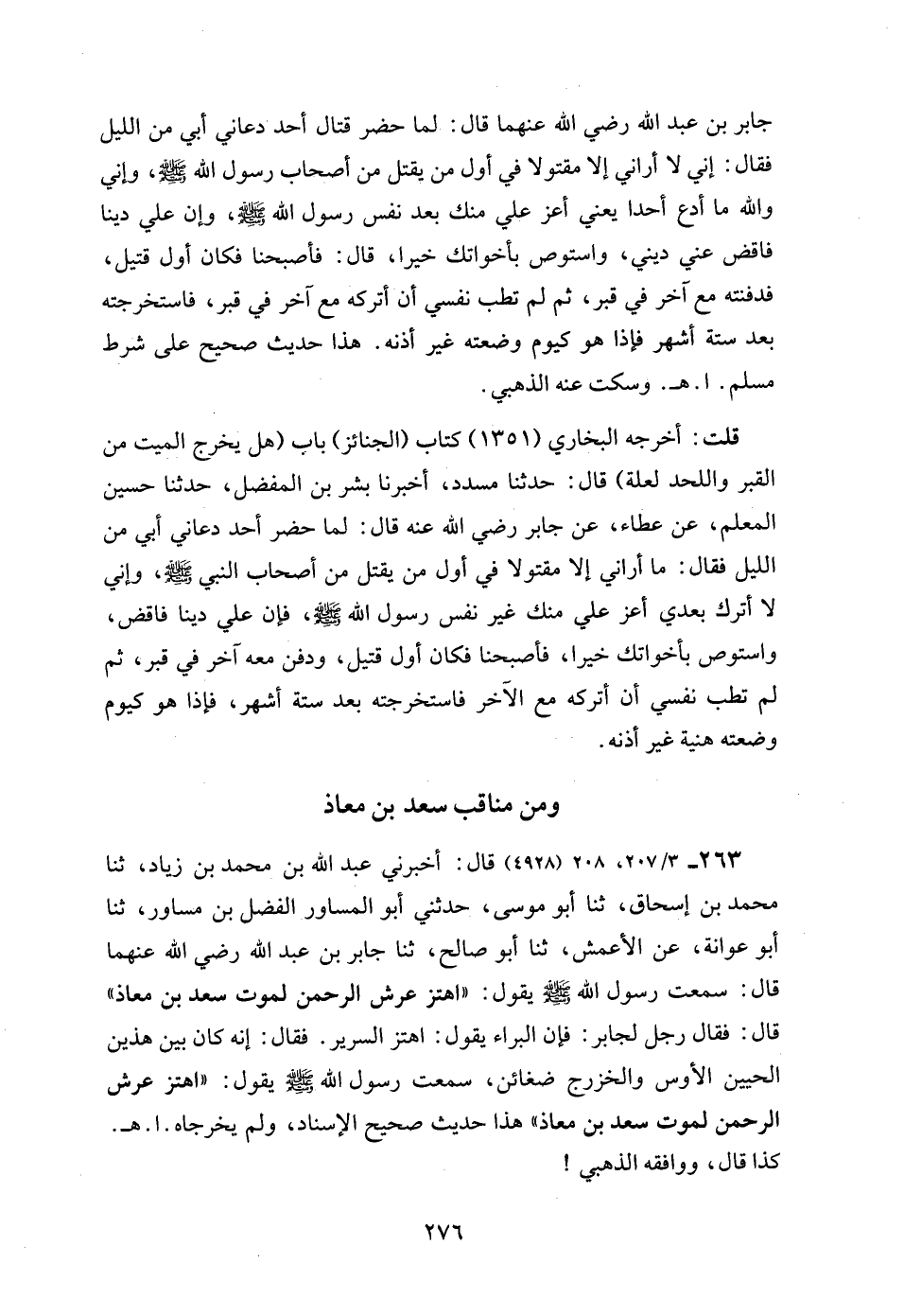 263 - 3/ 207، 208 (4928) قال: أخبرني عبد الله بن محمد بن زياد، ثنا محمد بن إسحاق، ثنا أبو موسى، حدثني أبو المساور الفضل بن مساور، ثنا أبو عوانة، عن الأعمش، ثنا أبو صالح، ثنا جابر بن عبد الله رضي الله عنهما قال: سمعت رسول الله - صلى الله عليه وسلم - يقول: "اهتز عرش الرحمن لموت سعد بن معاذ" قال: فقال رجل لجابر: فإن البراء يقول: اهتز السرير. فقال: إنه كان بين هذين الحيين الأوس والخزرج ضغائن، سمعت رسول الله - صلى الله عليه وسلم - يقول: "اهتز عرش الرحمن لموت سعد بن معاذ" هذا حديث صحيح الإسناد، ولم يخرجاه. ا. هـ.