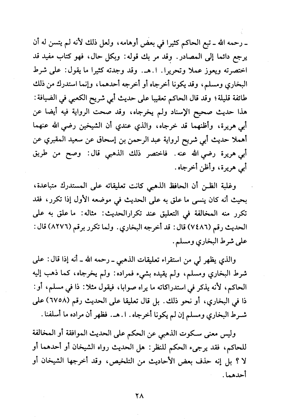 - رحمه الله - تبع الحاكم كثيرا في بعض أوهامه، ولعل ذلك لأنه لم يتسن له أن يرجع دائما إلى المصادر. وقد مر بك قوله: وبكل حال، فهو كتاب مفيد قد اختصرته ويعوز عملا وتحريرا. ا. هـ. وقد وجدته كثيرا ما يقول: على شرط البخاري ومسلم، وقد يكونا أخرجاه أو أخرجه أحدهما، وإنما استدرك من ذلك طائفة قليلة؛ وقد قال الحاكم تعقيبا على حديث أبي شريح الكعبي في الضيافة: هذا حديث صحيح الإسناد ولم يخرجاه، وقد صحت الرواية فيه أيضًا عن أبي هريرة، وأظنهما قد خرجاه، والذي عندي أن الشيخين رضي الله عنهما أهملا حديث أبي شريح لرواية عبد الرحمن بن إسحاق عن سعيد المقبري عن أبي هريرة رضي الله عنه. فاختصر ذلك الذهبي قال: وصح من طريق أبي هريرة، وأظن أخرجاه.