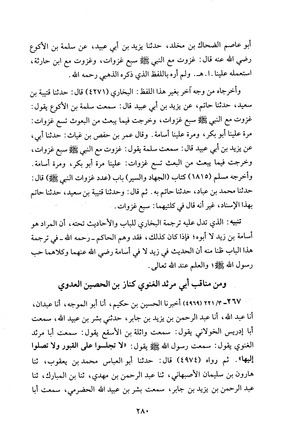 267 - 3/ 221 (4969) أخبرنا الحسين بن حكيم، أنا أبو الموجه، أنا عبدان، أنا عبد الله، أنا عبد الرحمن بن يزيد بن جابر، حدثني بشر بن عبيد الله، سمعت أبا إدريس الخولاني يقول: سمعت واثلة بن الأسقع يقول: سمعت أبا مرثد الغنوي يقول: سمعت رسول الله - صلى الله عليه وسلم - يقول: "لا تجلسوا على القبور ولا تصلوا إليها". ثم رواه (4974) قال: حدثنا أبو العباس محمد بن يعقوب، ثنا هارون بن سليمان الأصبهاني، ثنا عبد الرحمن بن مهدي، ثنا بن المبارك، ثنا عبد الرحمن بن يزيد بن جابر، سمعت بشر بن عبيد الله الحضرمي، سمعت أبا