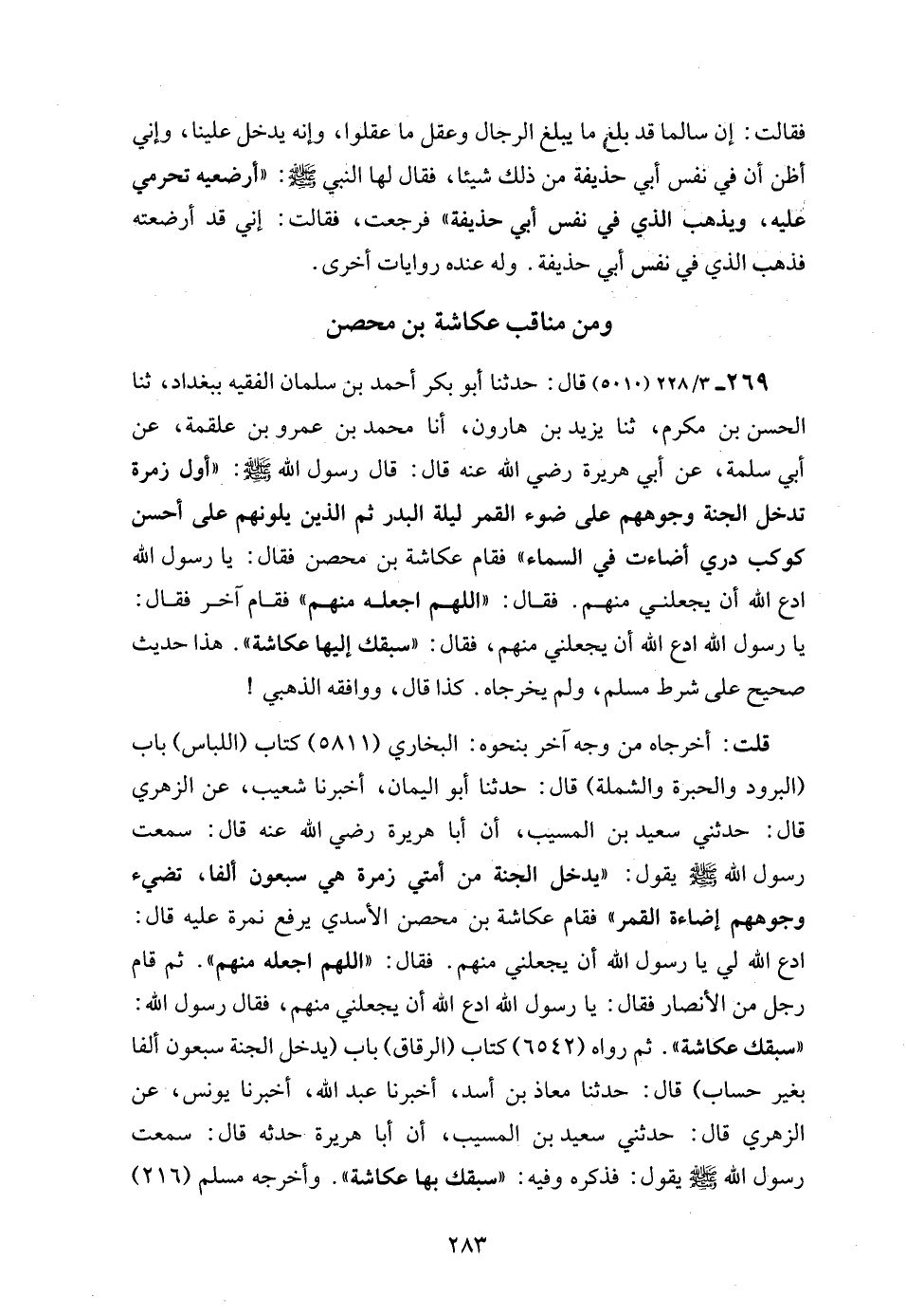 269 - 3/ 228 (5010) قال: حدثنا أبو بكر أحمد بن سلمان الفقيه ببغداد، ثنا الحسن بن مكرم، ثنا يزيد بن هارون، أنا محمد بن عمرو بن علقمة، عن أبي سلمة، عن أبي هريرة رضي الله عنه قال: قال رسول الله - صلى الله عليه وسلم -: "أول زمرة تدخل الجنة وجوههم على ضوء القمر ليلة البدر ثم الذين يلونهم على أحسن كوكب دري أضاءت في السماء" فقام عكاشة بن محصن فقال: يا رسول الله ادع الله أن يجعلني منهم. فقال: "اللهم اجعله منهم" فقام آخر فقال: يا رسول الله ادع الله أن يجعلني منهم، فقال: "سبقك إليها عكاشة". هذا حديث صحيح على شرط مسلم، ولم يخرجاه. كذا قال، ووافقه الذهبي!
