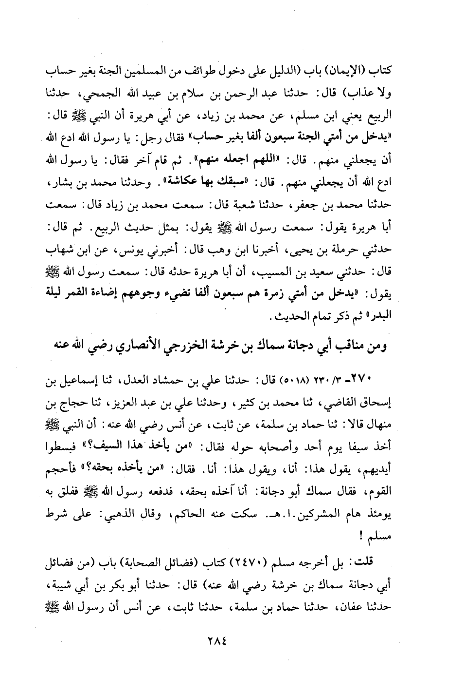 كتاب (الإيمان) باب (الدليل على دخول طوائف من المسلمين الجنة بغير حساب ولا عذاب) قال: حدثنا عبد الرحمن بن سلام بن عبيد الله الجمحي، حدثنا الربيع يعني ابن مسلم، عن محمد بن زياد، عن أبي هريرة أن النبي - صلى الله عليه وسلم - قال: "يدخل من أمتي الجنة سبعون ألفا بغير حساب" فقال رجل: يا رسول الله ادع الله أن يجعلني منهم. قال: "اللهم اجعله منهم". ثم قام آخر فقال: يا رسول الله ادع الله أن يجعلني منهم. قال: "سبقك بها عكاشة". وحدثنا محمد بن بشار، حدثنا محمد بن جعفر، حدثنا شعبة قال: سمعت محمد بن زياد قال: سمعت أبا هريرة يقول: سمعت رسول الله - صلى الله عليه وسلم - يقول: بمثل حديث الربيع. ثم قال: حدثني حرملة بن يحيى، أخبرنا ابن وهب قال: أخبرني يونس، عن ابن شهاب قال: حدثني سعيد بن المسيب، أن أبا هريرة حدثه قال: سمعت رسول الله - صلى الله عليه وسلم - يقول: "يدخل من أمتي زمرة هم سبعون ألفا تضيء وجوههم إضاءة القمر ليلة البدر" ثم ذكر تمام الحديث.