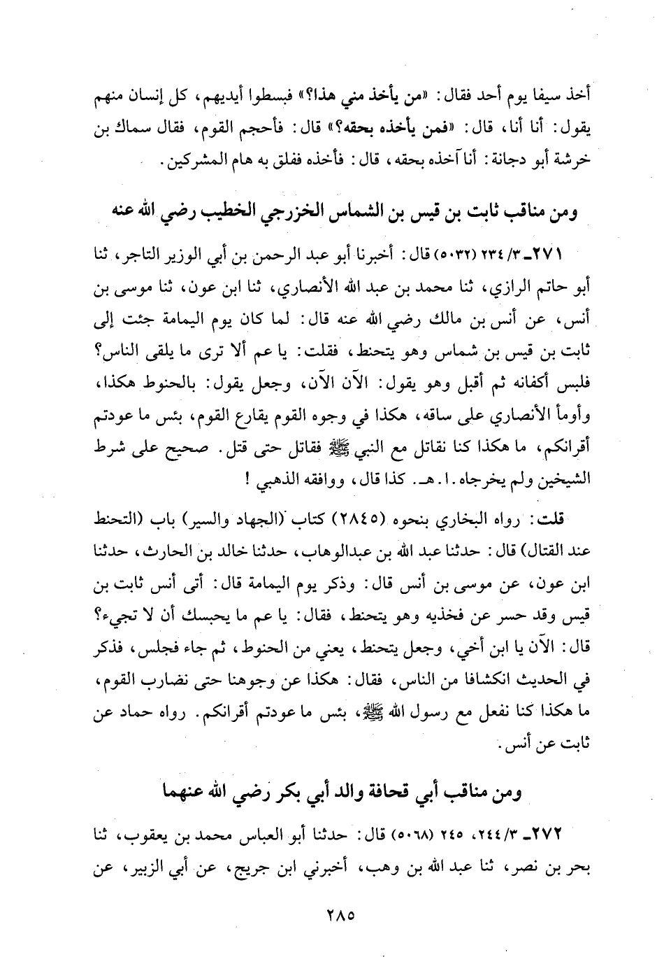 271 - 3/ 234 (5032) قال: أخبرنا أبو عبد الرحمن بن أبي الوزير التاجر، ثنا أبو حاتم الرازي، ثنا محمد بن عبد الله الأنصاري، ثنا ابن عون، ثنا موسى بن أنس، عن أنس بن مالك رضي الله عنه قال: لما كان يوم اليمامة جئت إلى ثابت بن قيس بن شماس وهو يتحنط، فقلت: يا عم ألا ترى ما يلقى الناس؟ فلبس أكفانه ثم أقبل وهو يقول: الآن الآن، وجعل يقول: بالحنوط هكذا، وأومأ الأنصاري على ساقه، هكذا في وجوه القوم يقارع القوم، بئس ما عودتم أقرانكم، ما هكذا كنا نقاتل مع النبي - صلى الله عليه وسلم - فقاتل حتى قتل. صحيح على شرط الشيخين ولم يخرجاه. ا. هـ. كذا قال، ووافقه الذهبي!
