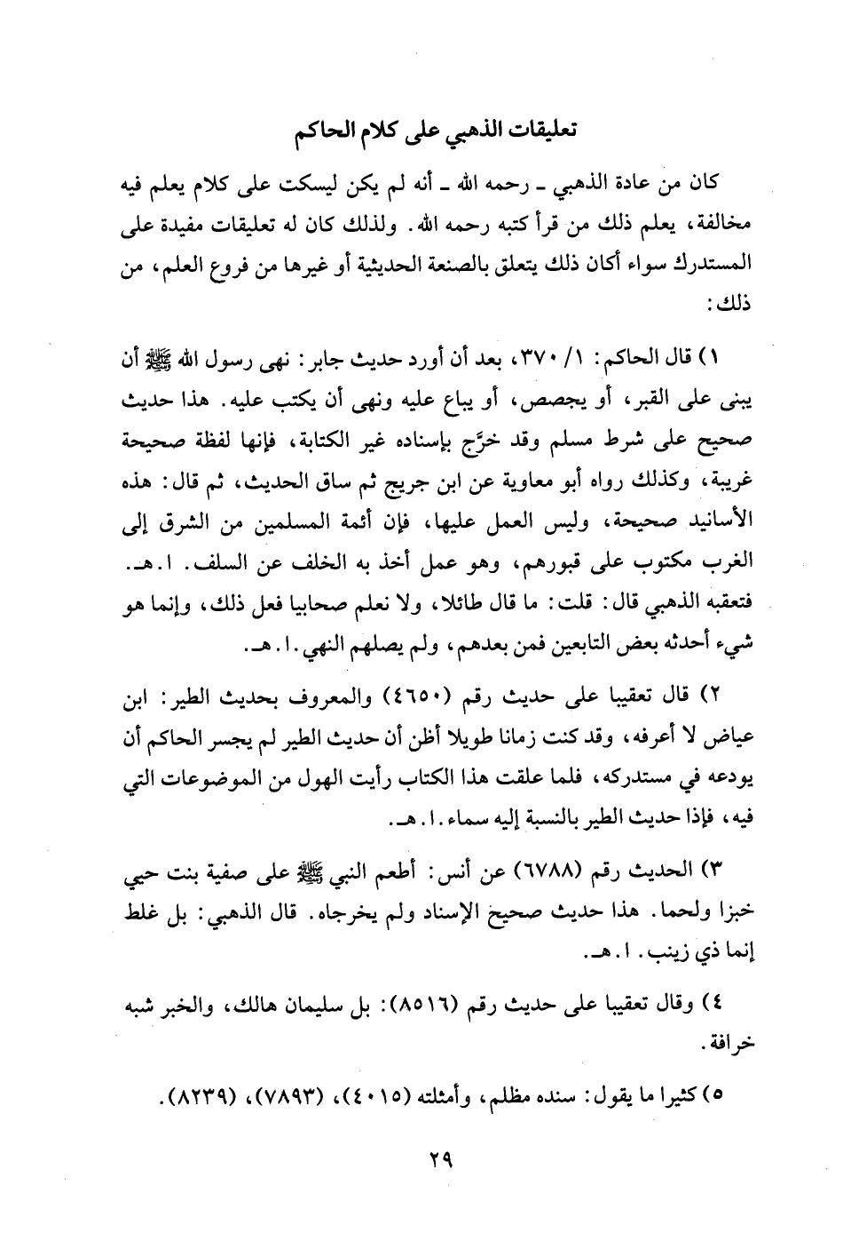 كان من عادة الذهبي - رحمه الله - أنه لم يكن ليسكت على كلام يعلم فيه مخالفة، يعلم ذلك من قرأ كتبه رحمه الله. ولذلك كان له تعليقات مفيدة على المستدرك سواء أكان ذلك يتعلق بالصنعة الحديثية أو غيرها من فروع العلم، من ذلك: