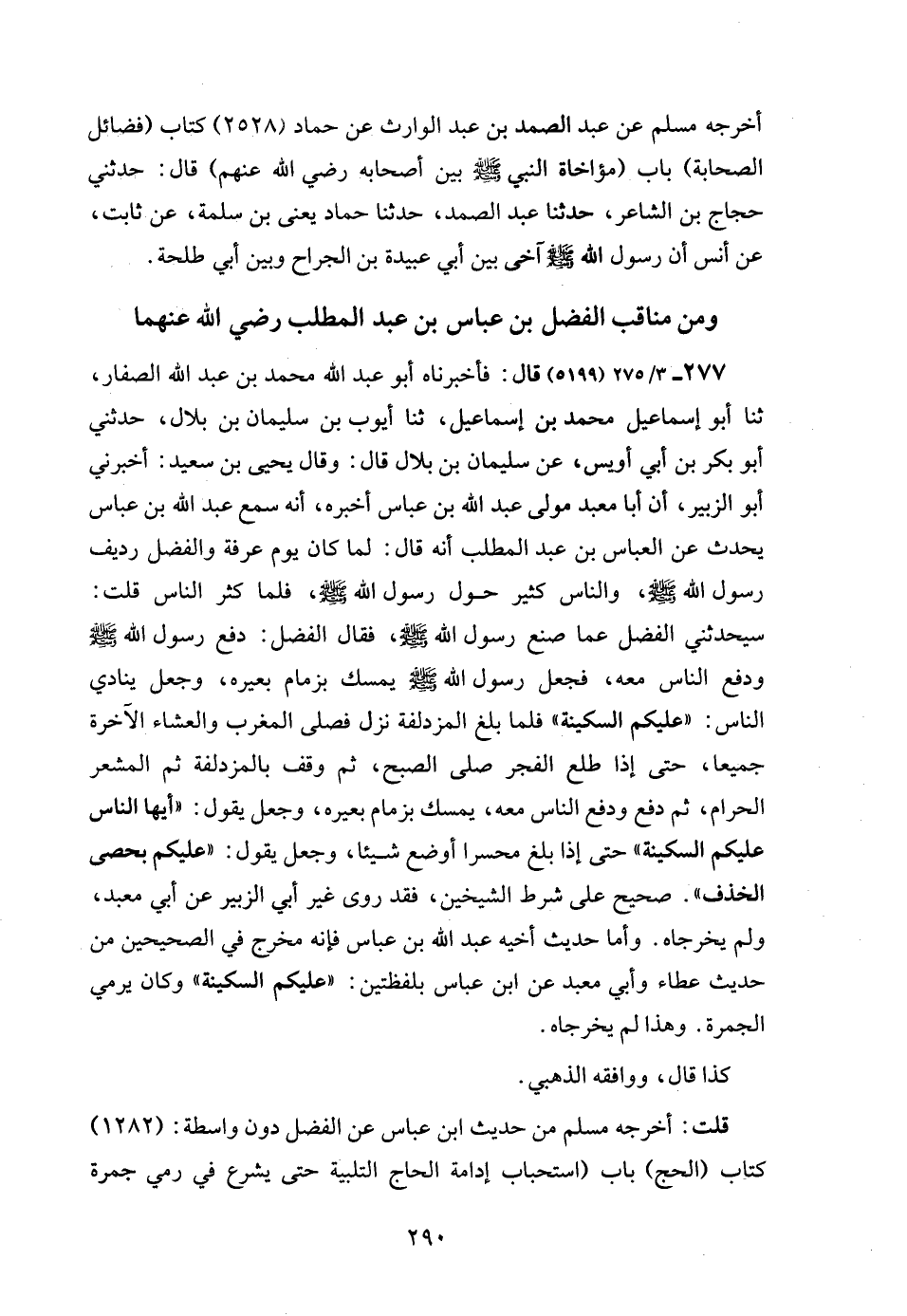 277 - 3/ 275 (5199) قال: فأخبرناه أبو عبد الله محمد بن عبد الله الصفار، ثنا أبو إسماعيل محمد بن إسماعيل، ثنا أيوب بن سليمان بن بلال، حدثني أبو بكر بن أبي أويس، عن سليمان بن بلال قال: وقال يحيى بن سعيد: أخبرني أبو الزبير، أن أبا معبد مولى عبد الله بن عباس أخبره، أنه سمع عبد الله بن عباس يحدث عن العباس بن عبد المطلب أنه قال: لما كان يوم عرفة والفضل رديف رسول الله - صلى الله عليه وسلم -، والناس كثير حول رسول الله - صلى الله عليه وسلم -، فلما كثر الناس قلت: سيحدثني الفضل عما صنع رسول الله - صلى الله عليه وسلم -، فقال الفضل: دفع رسول الله - صلى الله عليه وسلم - ودفع الناس معه، فجعل رسول الله - صلى الله عليه وسلم - يمسك بزمام بعيره، وجعل ينادي الناس: "عليكم السكينة" فلما بلغ المزدلفة نزل فصلى المغرب والعشاء الآخرة جميعا، حتى إذا طلع الفجر صلى الصبح، ثم وقف بالمزدلفة ثم المشعر الحرام، ثم دفع ودفع الناس معه، يمسك بزمام بعيره، وجعل يقول: "أيها الناس عليكم السكينة" حتى إذا بلغ محسرا أوضع شيئا، وجعل يقول: "عليكم بحصى الخذف". صحيح على شرط الشيخين، فقد روى غير أبي الزبير عن أبي معبد، ولم يخرجاه. وأما حديث أخيه عبد الله بن عباس فإنه مخرج في الصحيحين من حديث عطاء وأبي معبد عن ابن عباس بلفظتين: "عليكم السكينة" وكان يرمي الجمرة. وهذا لم يخرجاه.