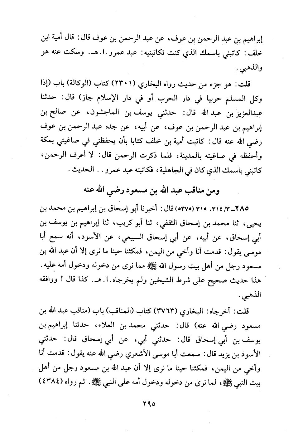 إبراهيم بن عبد الرحمن بن عوف، عن عبد الرحمن بن عوف قال: قال أمية ابن خلف: كاتبني باسمك الذي كنت تكاتبنيه: عبد عمرو. ا. هـ. وسكت عنه هو والذهبي.