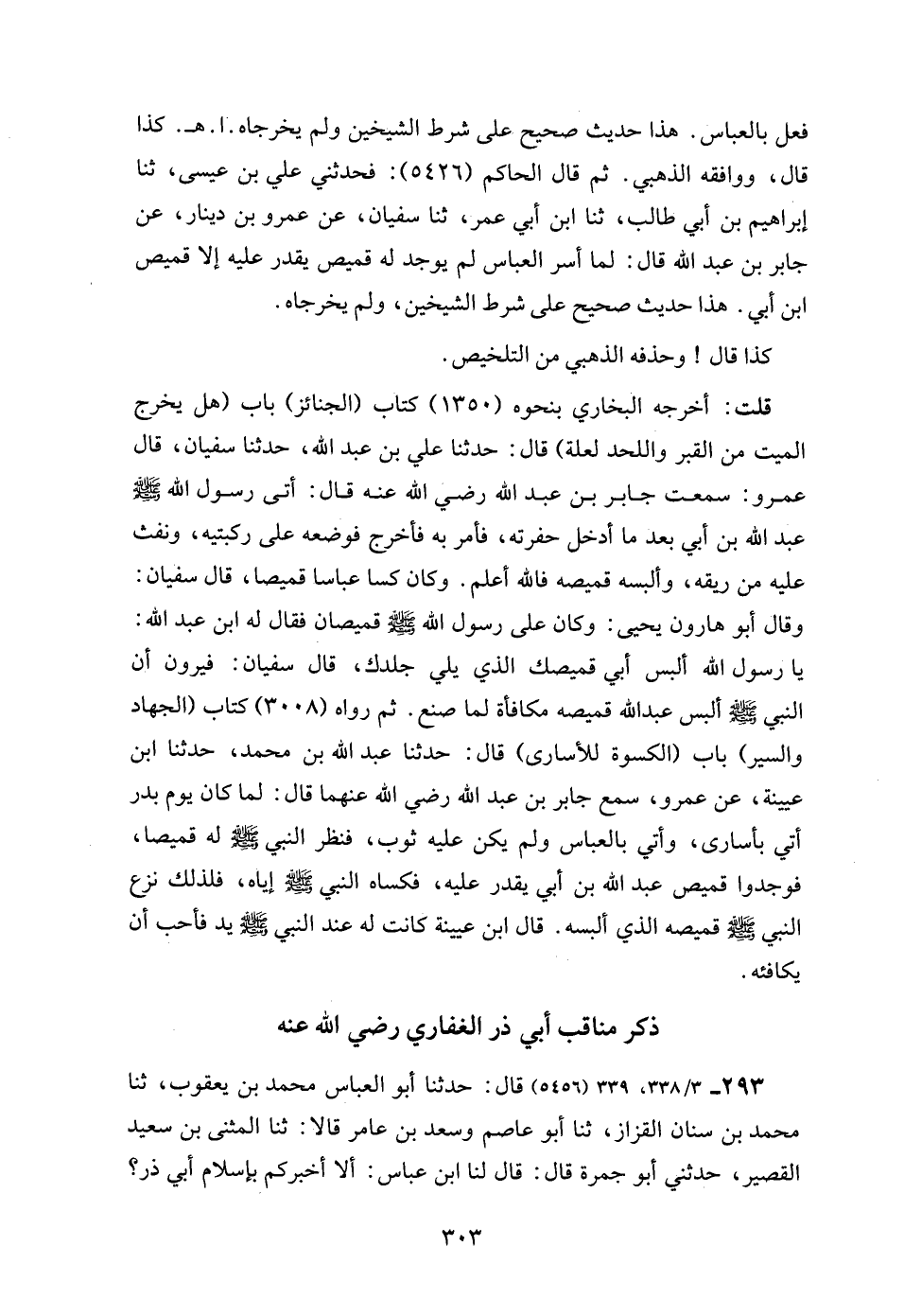 فعل بالعباس. هذا حديث صحيح على شرط الشيخين ولم يخرجاه. ا. هـ. كذا قال، ووافقه الذهبي. ثم قال الحاكم (5426): فحدثني علي بن عيسى، ثنا إبراهيم بن أبي طالب، ثنا ابن أبي عمر، ثنا سفيان، عن عمرو بن دينار، عن جابر بن عبد الله قال: لما أسر العباس لم يوجد له قميص يقدر عليه إلا قميص ابن أبي. هذا حديث صحيح على شرط الشيخين، ولم يخرجاه.