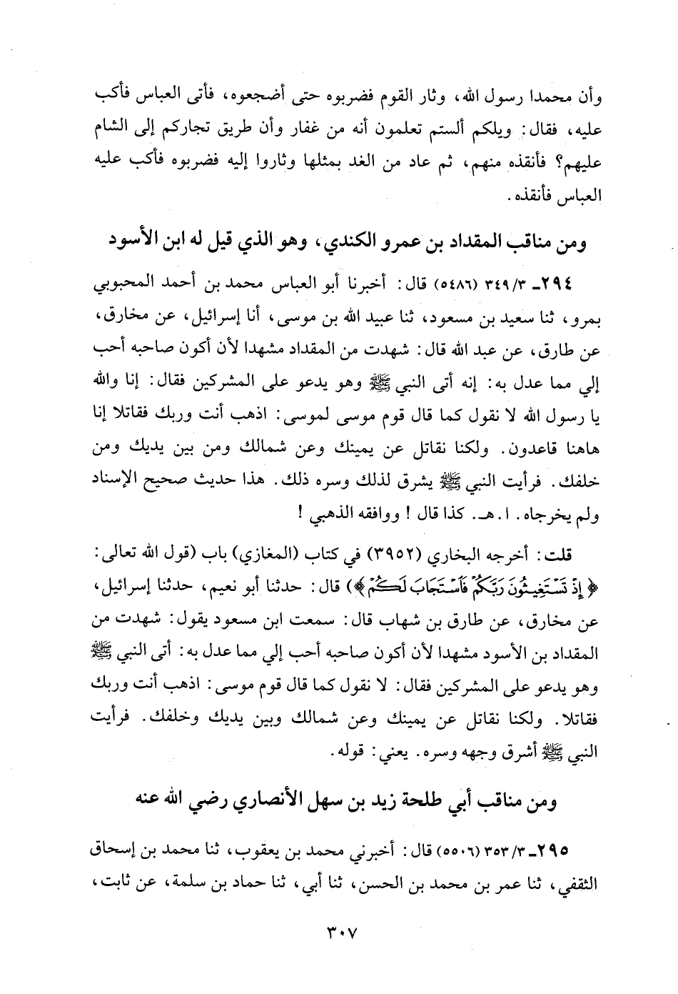 294 - 3/ 349 (5486) قال: أخبرنا أبو العباس محمد بن أحمد المحبوبي بمرو، ثنا سعيد بن مسعود، ثنا عبيد الله بن موسى، أنا إسرائيل، عن مخارق، عن طارق، عن عبد الله قال: شهدت من المقداد مشهدا لأن أكون صاحبه أحب إلي مما عدل به: إنه أتى النبي - صلى الله عليه وسلم - وهو يدعو على المشركين فقال: إنا والله يا رسول الله لا نقول كما قال قوم موسى لموسى: اذهب أنت وربك فقاتلا إنا ها هنا قاعدون. ولكنا نقاتل عن يمينك وعن شمالك ومن بين يديك ومن خلفك. فرأيت النبي - صلى الله عليه وسلم - يشرق لذلك وسره ذلك. هذا حديث صحيح الإسناد ولم يخرجاه. ا. هـ. كذا قال! ووافقه الذهبي!