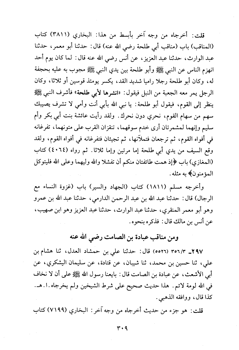 قلت: أخرجاه من وجه آخر بأبسط من هذا: البخاري (3811) كتاب (المناقب) باب (مناقب أبي طلحة رضي الله عنه) قال: حدثنا أبو معمر، حدثنا عبد الوارث، حدثنا عبد العزيز، عن أنس رضي الله عنه قال: لما كان يوم أحد انهزم الناس عن النبي - صلى الله عليه وسلم - وأبو طلحة بين يدي النبي - صلى الله عليه وسلم - مجوب به عليه بحجفة له، وكان أبو طلحة رجلا راميا شديد القد، يكسر يومئذ قوسين أو ثلاثا، وكان الرجل يمر معه الجعبة من الثبل فيقول: "انشرها لأبي طلحة" فأشرف النبي - صلى الله عليه وسلم - ينظر إلى القوم، فيقول أبو طلحة: يا نبي الله بأبي أنت وأمي لا تشرف يصيبك سهم من سهام القوم، نحري دون نحرك. ولقد رأيت عائشة بنت أبي بكر وأم سليم وإنهما لمشمرتان أرى خدم سوقهما، تنقزان القرب على متونهما، تفرغانه في أفواه القوم، ثم ترجعان فتملآنها، ثم تجيئان فتفرغانه في أفواه القوم، ولقد وقع السيف من يدي أبي طلحة إما مرتين وإما ثلاثا. ثم رواه (4064) كتاب (المغازي) باب {إِذْ هَمَّتْ طَائِفَتَانِ مِنْكُمْ أَنْ تَفْشَلَا وَاللَّهُ وَلِيُّهُمَا وَعَلَى اللَّهِ فَلْيَتَوَكَّلِ الْمُؤْمِنُونَ} به مثله.