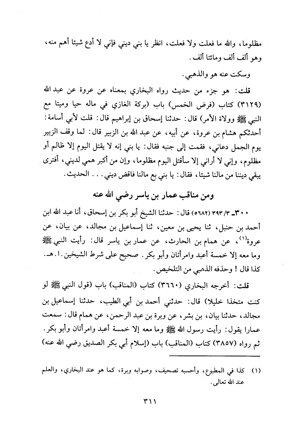 قلت: أخرجه البخاري (3660) كتاب (المناقب) باب (قول النبي - صلى الله عليه وسلم - لو كنت متخذا خليلا) قال: حدثني أحمد بن أبي الطيب، حدثنا إسماعيل بن مجالد، حدثنا بيان، بن بشر، عن وبرة بن عبد الرحمن، عن همام قال: سمعت عمارا يقول: رأيت رسول الله - صلى الله عليه وسلم - وما معه إلا خمسة أعبد وامرأتان وأبو بكر. ثم رواه (3857) كتاب (المناقب) باب (إسلام أبي بكر الصديق رضي الله عنه)