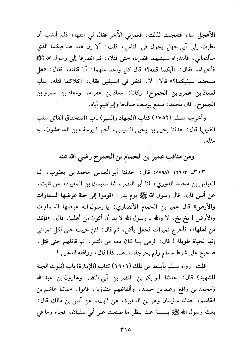 303 - 3/ 426 (5798) قال: حدثنا أبو العباس محمد بن يعقوب، ثنا العباس بن محمد الدوري، ثنا أبو النضر، ثنا سليمان بن المغيرة، عن ثابت، عن أنس قال: قال رسول الله - صلى الله عليه وسلم - يوم بدر: "قوموا إلى جنة عرضها السماوات والأرض" قال عمير بن الحمام الأنصاري: يا رسول الله عرضها السماوات والأرض! بخ بخ، لا والله يا رسول الله لا بد أن أكون من أهلها، قال: "فإنك من أهلها"، فأخرج تميرات فجعل يأكل، ثم قال: لئن حييت حتى آكل تمراتي إنها لحياة طويلة! قال: فرمى بما كان معه من التمر، ثم قاتلهم حتى قتل. صحيح على شرط مسلم ولم يخرجاه. ا. هـ. كذا قال، ووافقه الذهبي!