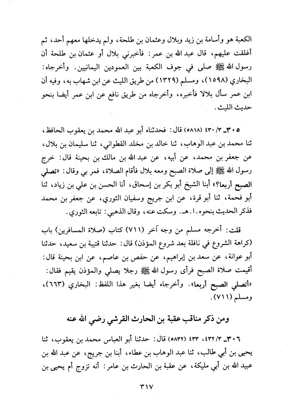 306 - 3/ 432، 433 (5832) قال: حدثنا أبو العباس محمد بن يعقوب، ثنا يحيى بن أبي طالب، ثنا عبد الوهاب بن عطاء، أبنا بن جريج، عن عبد الله بن عبيد الله بن أبي مليكة، عن عقبة بن الحارث بن عامر: أنه تزوج أم يحيى بن