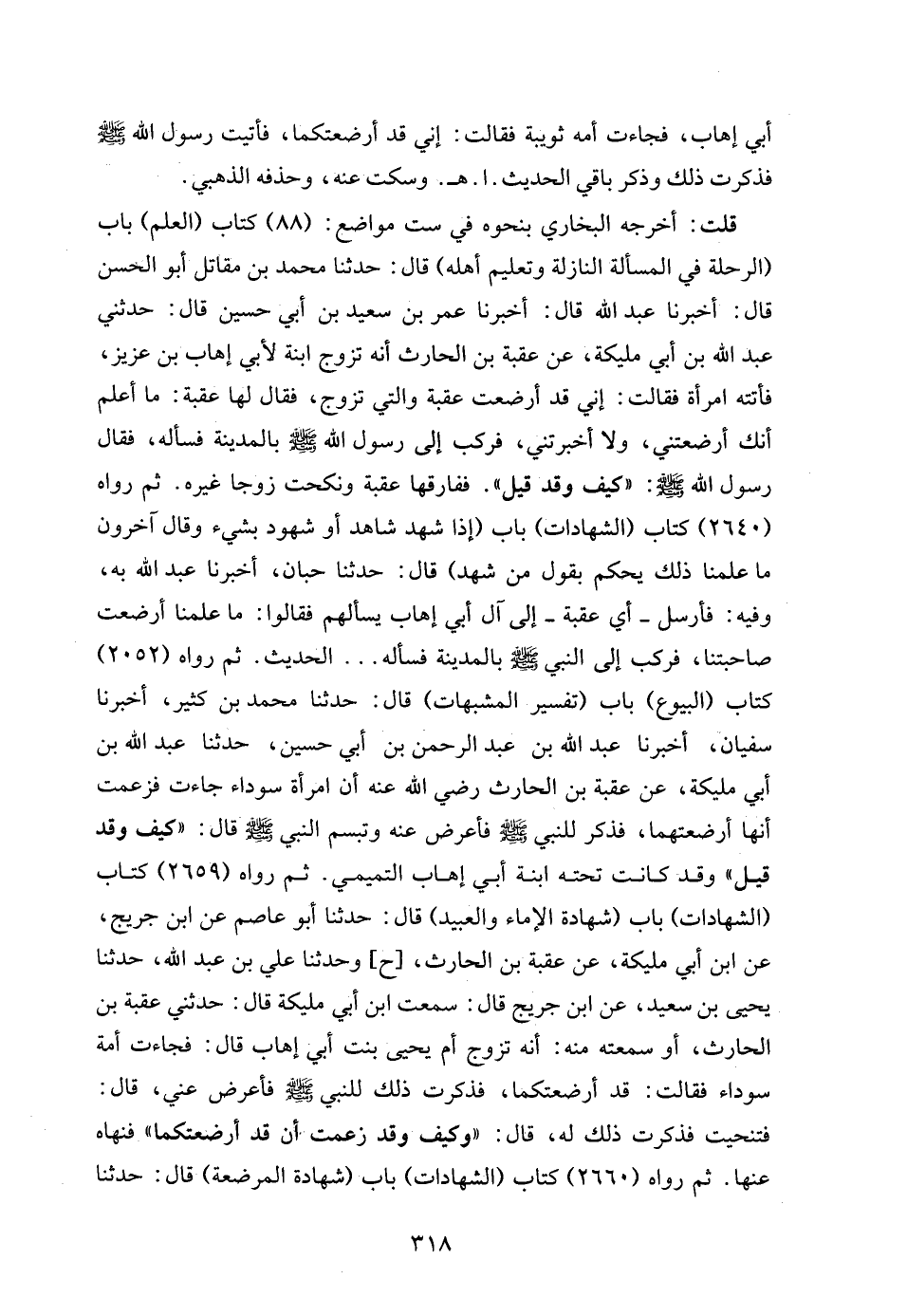 قلت: أخرجه البخاري بنحوه في ست مواضع: (88) كتاب (العلم) باب (الرحلة في المسألة النازلة وتعليم أهله) قال: حدثنا محمد بن مقاتل أبو الحسن قال: أخبرنا عبد الله قال: أخبرنا عمر بن سعيد بن أبي حسين قال: حدثني عبد الله بن أبي مليكة، عن عقبة بن الحارث أنه تزوج ابنة لأبي إهاب بن عزيز، فأتته امرأة فقالت: إني قد أرضعت عقبة والتي تزوج، فقال لها عقبة: ما أعلم أنك أرضعتني، ولا أخبرتني، فركب إلى رسول الله - صلى الله عليه وسلم - بالمدينة فسأله، فقال رسول الله - صلى الله عليه وسلم -: "كيف وقد قيل". ففارقها عقبة ونكحت زوجا غيره. ثم رواه (2640) كتاب (الشهادات) باب (إذا شهد شاهد أو شهود بشيء وقال آخرون ما علمنا ذلك يحكم بقول من شهد) قال: حدثنا حبان، أخبرنا عبد الله به، وفيه: فأرسل - أي عقبة - إلى آل أبي إهاب يسألهم فقالوا: ما علمنا أرضعت صاحبتنا، فركب إلى النبي - صلى الله عليه وسلم - بالمدينة فسأله ... الحديث. ثم رواه (2052) كتاب (البيوع) باب (تفسير المشبهات) قال: حدثنا محمد بن كثير، أخبرنا سفيان، أخبرنا عبد الله بن عبد الرحمن بن أبي حسين، حدثنا عبد الله بن أبي مليكة، عن عقبة بن الحارث رضي الله عنه أن امرأة سوداء جاءت فزعمت أنها أرضعتهما، فذكر للنبي - صلى الله عليه وسلم - فأعرض عنه وتبسم النبي - صلى الله عليه وسلم - قال: "كيف وقد قيل" وقد كانت تحته ابنة أبي إهاب التميمي. ثم رواه (2659) كتاب (الشهادات) باب (شهادة الإماء والعبيد) قال: حدثنا أبو عاصم عن ابن جريج، عن ابن أبي مليكة، عن عقبة بن الحارث، [ح] وحدثنا علي بن عبد الله، حدثنا يحيى بن سعيد، عن ابن جريج قال: سمعت ابن أبي مليكة قال: حدثني عقبة بن الحارث، أو سمعته منه: أنه تزوج أم يحيى بنت أبي إهاب قال: فجاءت أمة سوداء فقالت: قد أرضعتكما، فذكرت ذلك للنبي - صلى الله عليه وسلم - فأعرض عني، قال: فتنحيت فذكرت ذلك له، قال: "وكيف وقد زعمت أن قد أرضعتكما" فنهاه عنها. ثم رواه (2660) كتاب (الشهادات) باب (شهادة المرضعة) قال: حدثنا