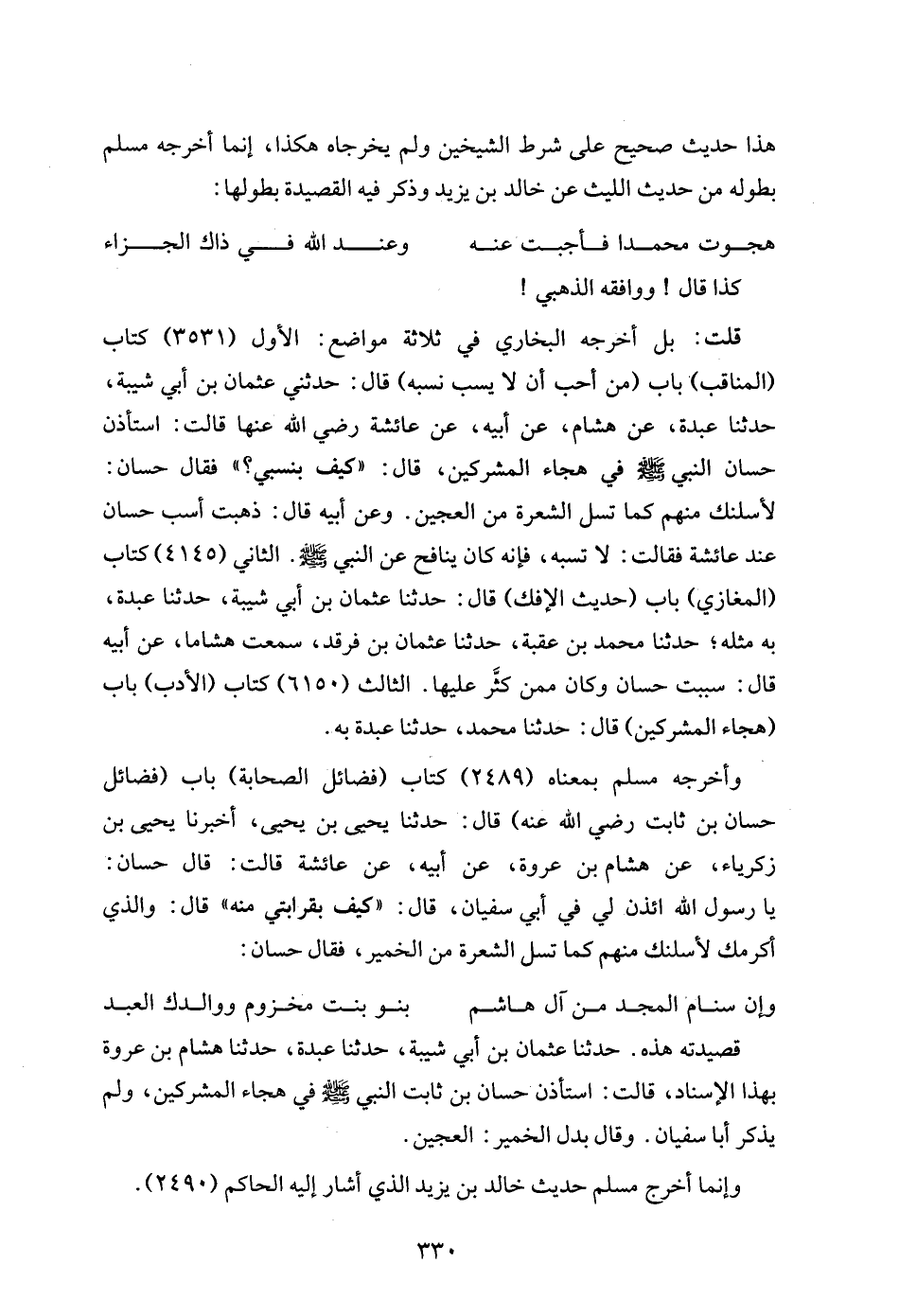 قلت: بل أخرجه البخاري في ثلاثة مواضع: الأول (3531) كتاب (المناقب) باب (من أحب أن لا يسب نسبه) قال: حدثني عثمان بن أبي شيبة، حدثنا عبدة، عن هشام، عن أبيه، عن عائشة رضي الله عنها قالت: استأذن حسان النبي - صلى الله عليه وسلم - في هجاء المشركين، قال: "كيف بنسبي؟ " فقال حسان: لأسلنك منهم كما تسل الشعرة من العجين. وعن أبيه قال: ذهبت أسب حسان عند عائشة فقالت: لا تسبه، فإنه كان ينافح عن النبي - صلى الله عليه وسلم -. الثاني (4145) كتاب (المغازي) باب (حديث الإفك) قال: حدثنا عثمان بن أبي شيبة، حدثنا عبدة، به مثله؛ حدثنا محمد بن عقبة، حدثنا عثمان بن فرقد، سمعت هشاما، عن أبيه قال: سببت حسان وكان ممن كثَّر عليها. الثالث (6150) كتاب (الأدب) باب (هجاء المشركين) قال: حدثنا محمد، حدثنا عبدة به.