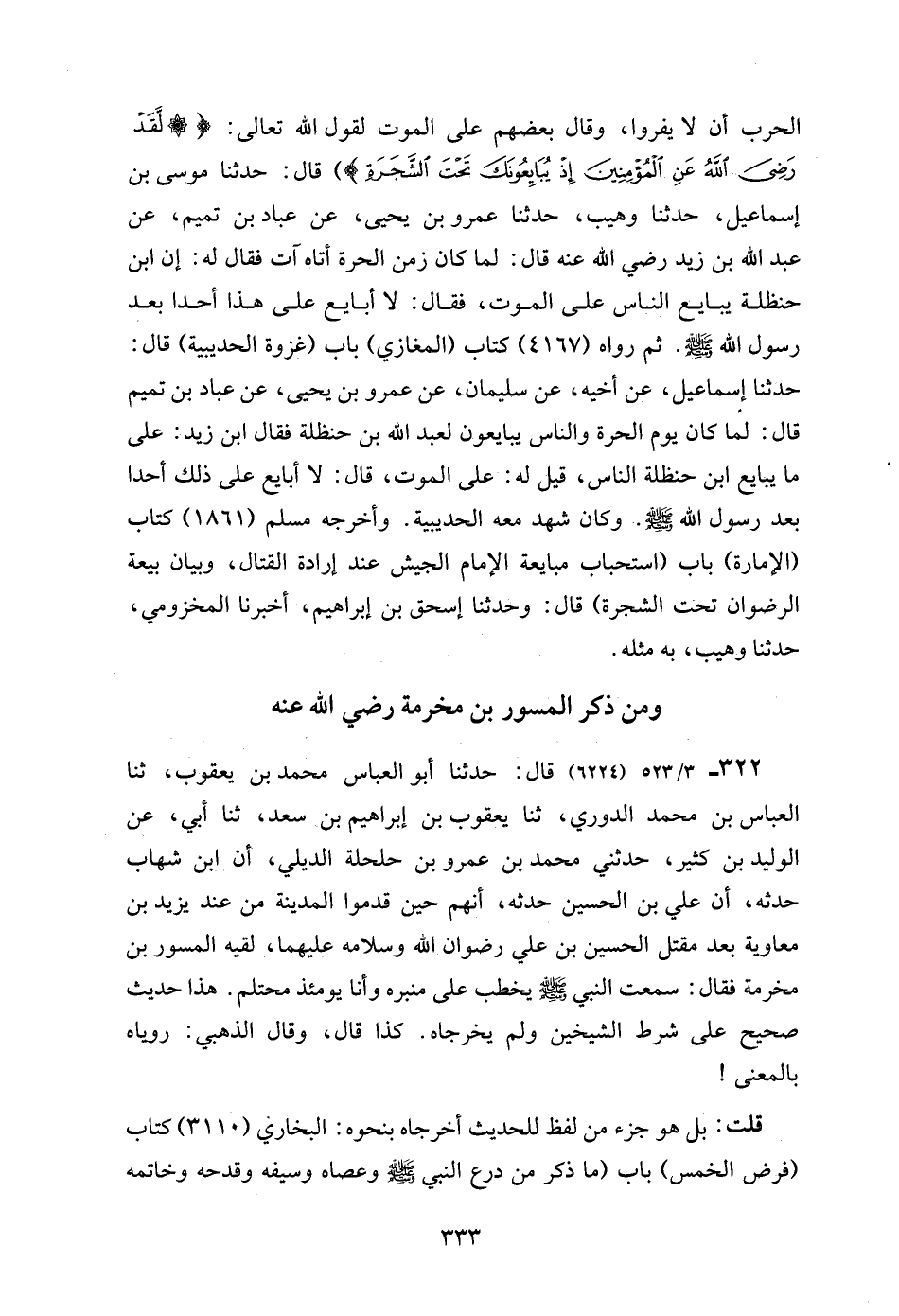 322 - 3/ 523 (6224) قال: حدثنا أبو العباس محمد بن يعقوب، ثنا العباس بن محمد الدوري، ثنا يعقوب بن إبراهيم بن سعد، ثنا أبي، عن الوليد بن كثير، حدثني محمد بن عمرو بن حلحلة الديلي، أن ابن شهاب حدثه، أن علي بن الحسين حدثه، أنهم حين قدموا المدينة من عند يزيد بن معاوية بعد مقتل الحسين بن علي رضوان الله وسلامه عليهما، لقيه المسور بن مخرمة فقال: سمعت النبي - صلى الله عليه وسلم - يخطب على منبره وأنا يومئذ محتلم. هذا حديث صحيح على شرط الشيخين ولم يخرجاه. كذا قال، وقال الذهبي: روياه بالمعنى!