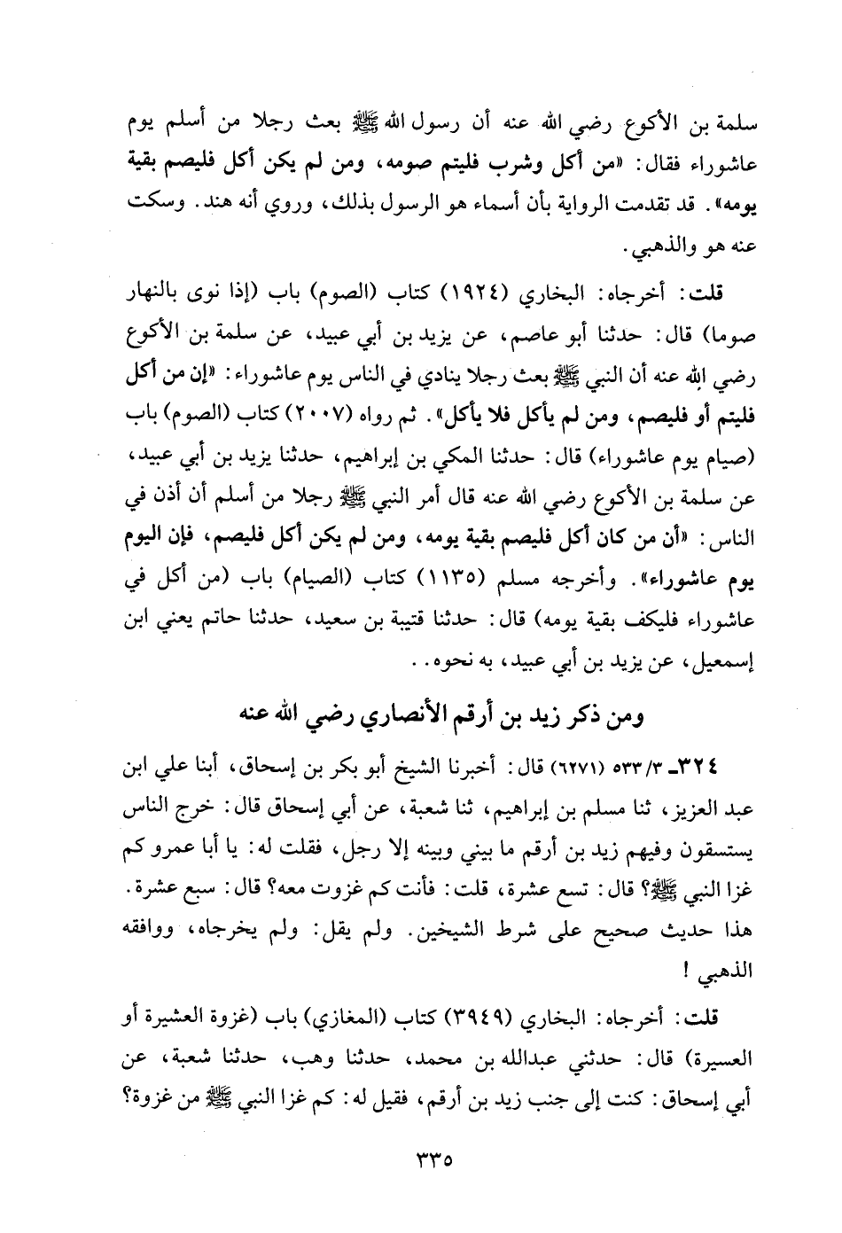 324 - 3/ 533 (6271) قال: أخبرنا الشيخ أبو بكر بن إسحاق، أبنا علي ابن عبد العزيز، ثنا مسلم بن إبراهيم، ثنا شعبة، عن أبي إسحاق قال: خرج الناس يستسقون وفيهم زيد بن أرقم ما بيني وبينه إلا رجل، فقلت له: يا أبا عمرو كم غزا النبي - صلى الله عليه وسلم -؟ قال: تسع عشرة، قلت: فأنت كم غزوت معه؟ قال: سبع عشرة. هذا حديث صحيح على شرط الشيخين. ولم يقل: ولم يخرجاه، ووافقه الذهبي!