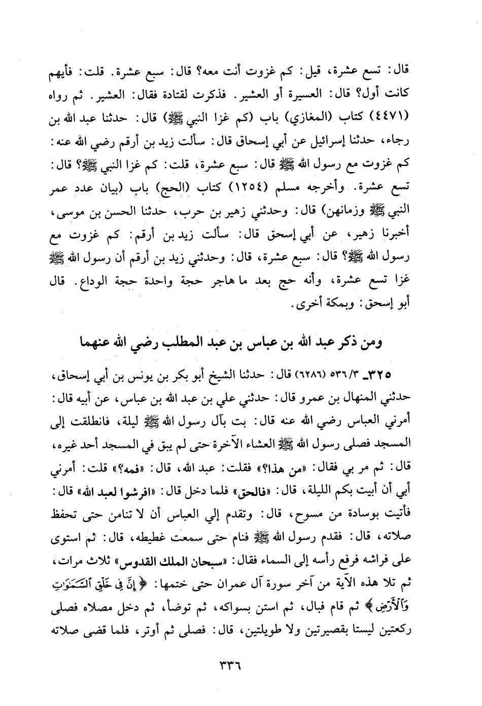 325 - 3/ 536 (6286) قال: حدثنا الشيخ أبو بكر بن يونس بن أبي إسحاق، حدثني المنهال بن عمرو قال: حدثني علي بن عبد الله بن عباس، عن أبيه قال: أمرني العباس رضي الله عنه قال: بت بآل رسول الله - صلى الله عليه وسلم - ليلة، فانطلقت إلى المسجد فصلى رسول الله - صلى الله عليه وسلم - العشاء الآخرة حتى لم يبق في المسجد أحد غيره، قال: ثم مر بي فقال: "من هذا؟ " فقلت: عبد الله، قال: "فمه؟ " قلت: أمرني أبي أن أبيت بكم الليلة، قال: "فالحق" فلما دخل قال: "افرشوا لعبد الله" قال: فأتيت بوسادة من مسوح، قال: وتقدم إلي العباس أن لا تنامن حتى تحفظ صلاته، قال: فقدم رسول الله - صلى الله عليه وسلم - فنام حتى سمعت غطيطه، قال: ثم استوى على فراشه فرفع رأسه إلى السماء فقال: "سبحان الملك القدوس" ثلاث مرات، ثم تلا هذه الآية من آخر سورة آل عمران حتى ختمها: {إِنَّ فِي خَلْقِ السَّمَاوَاتِ وَالْأَرْضِ} ثم قام فبال، ثم استن بسواكه، ثم توضأ، ثم دخل مصلاه فصلى ركعتين ليستا بقصيرتين ولا طويلتين، قال: فصلى ثم أوتر، فلما قضى صلاته