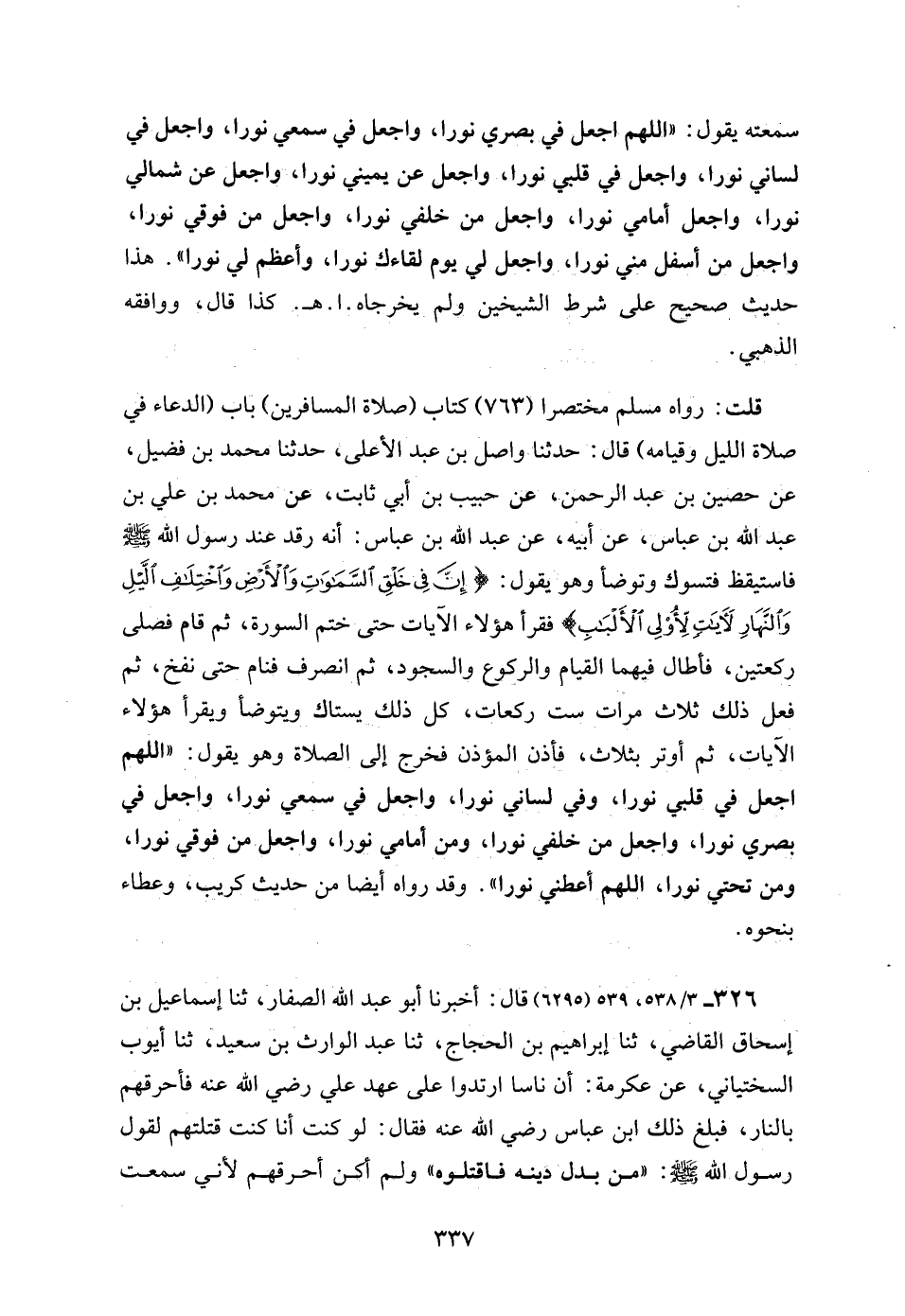 سمعته يقول: "اللهم اجعل في بصري نورا، واجعل في سمعي نورا، واجعل في لساني نورا، واجعل في قلبي نورا، واجعل عن يميني نورا، واجعل عن شمالي نورا، واجعل أمامي نورا، واجعل من خلفي نورا، واجعل من فوقي نورا، واجعل من أسفل مني نورا، واجعل لي يوم لقاءك نورا، وأعظم لي نورا". هذا حديث صحيح على شرط الشيخين ولم يخرجاه. ا. هـ. كذا قال، ووافقه الذهبي.