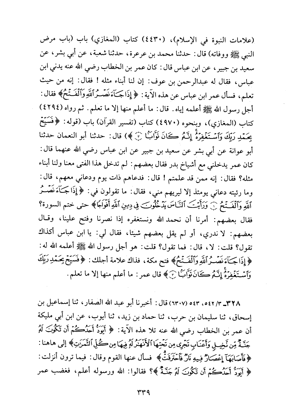 (علامات النبوة في الإسلام)، (4430) كتاب (المغازي) باب (باب مرض النبي - صلى الله عليه وسلم - ووفاته) قال: حدثنا محمد بن عرعرة، حدثنا شعبة، عن أبي بشر، عن سعيد بن جبير، عن ابن عباس قال: كان عمر بن الخطاب رضي الله عنه يدني ابن عباس، فقال له عبد الرحمن بن عوف: إن لنا أبناء مثله! فقال: إنه من حيث تعلم، فسأل عمر ابن عباس عن هذه الآية: {إِذَا جَاءَ نَصْرُ اللَّهِ وَالْفَتْحُ} فقال: أجل رسول الله - صلى الله عليه وسلم - أعلمه إياه. قال: ما أعلم منها إلا ما تعلم. ثم رواه (4294) كتاب (المغازي)، وبنحوه (4970) كتاب (تفسير القرآن) باب (قوله: {فَسَبِّحْ بِحَمْدِ رَبِّكَ وَاسْتَغْفِرْهُ إِنَّهُ كَانَ تَوَّابًا (3)}) قال: حدثنا أبو النعمان حدثنا أبو عوانة عن أبي بشر عن سعيد بن جبير عن ابن عباس رضي الله عنهما قال: كان عمر يدخلني مع أشياخ بدر فقال بعضهم: لم تدخل هذا الفتى معنا ولنا أبناء مثله؟ فقال: إنه ممن قد علمتم! قال: فدعاهم ذات يوم ودعاني معهم، قال: وما رئيته دعاني يومئذ إلا ليريهم مني، فقال: ما تقولون في: {إِذَا جَاءَ نَصْرُ اللَّهِ وَالْفَتْحُ (1) وَرَأَيْتَ النَّاسَ يَدْخُلُونَ فِي دِينِ اللَّهِ أَفْوَاجًا} حتى ختم السورة؟ فقال بعضهم: أمرنا أن نحمد الله ونستغفره إذا نصرنا وفتح علينا، وقال بعضهم: لا ندري، أو لم يقل بعضهم شيئا، فقال لي: يا ابن عباس أكذاك تقول؟ قلت: لا، قال: فما تقول؟ قلت: هو أجل رسول الله - صلى الله عليه وسلم - أعلمه الله له: {إِذَا جَاءَ نَصْرُ اللَّهِ وَالْفَتْحُ} فتح مكة، فذاك علامة أجلك: {فَسَبِّحْ بِحَمْدِ رَبِّكَ وَاسْتَغْفِرْهُ إِنَّهُ كَانَ تَوَّابًا (3)} قال عمر: ما أعلم منها إلا ما تعلم.
