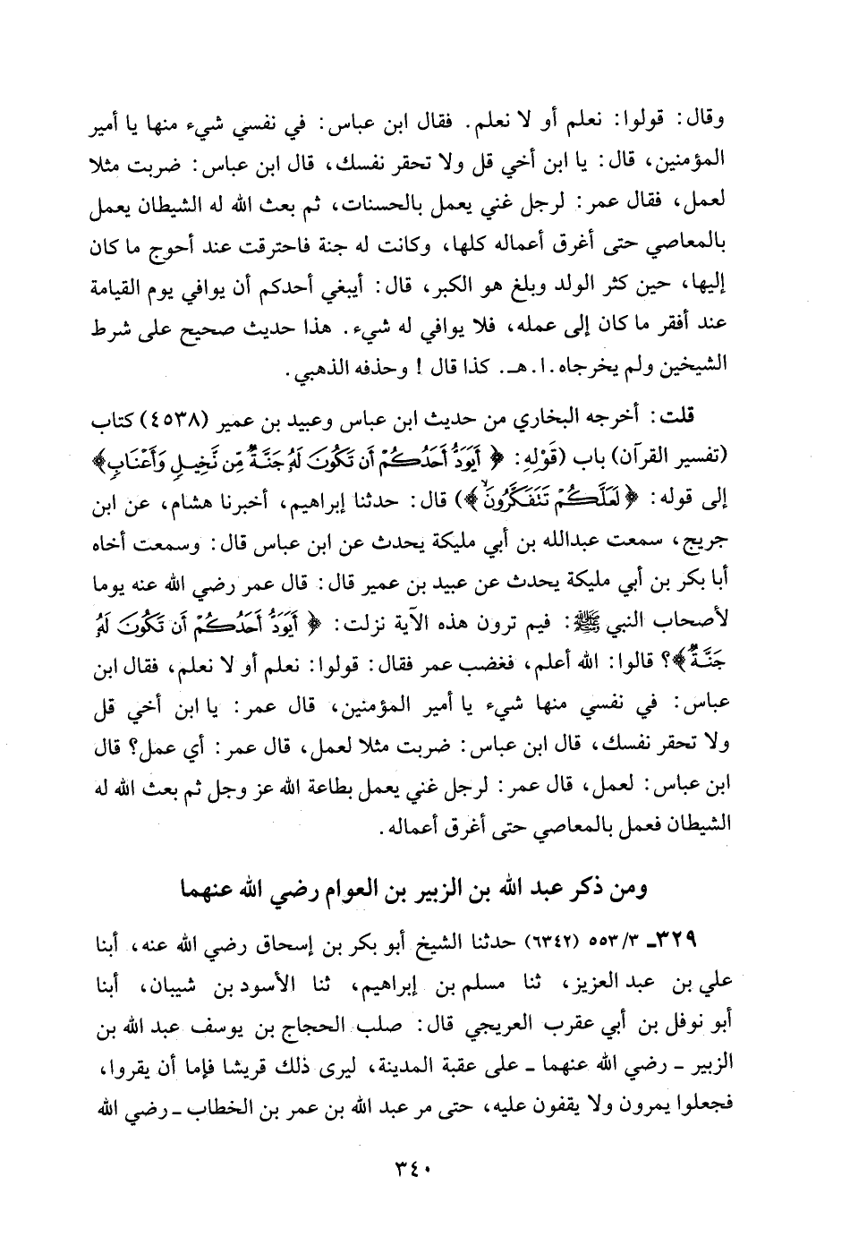وقال: قولوا: نعلم أو لا نعلم. فقال ابن عباس: في نفسي شيء منها يا أمير المؤمنين، قال: يا ابن أخي قل ولا تحقر نفسك، قال ابن عباس: ضربت مثلا لعمل، فقال عمر: لرجل غني يعمل بالحسنات، ثم بعث الله له الشيطان يعمل بالمعاصي حتى أغرق أعماله كلها، وكانت له جنة فاحترقت عند أحوج ما كان إليها، حين كثر الولد وبلغ هو الكبر، قال: أيبغي أحدكم أن يوافي يوم القيامة عند أفقر ما كان إلى عمله، فلا يوافي له شيء. هذا حديث صحيح على شرط الشيخين ولم يخرجاه. ا. هـ. كذا قال! وحذفه الذهبي.