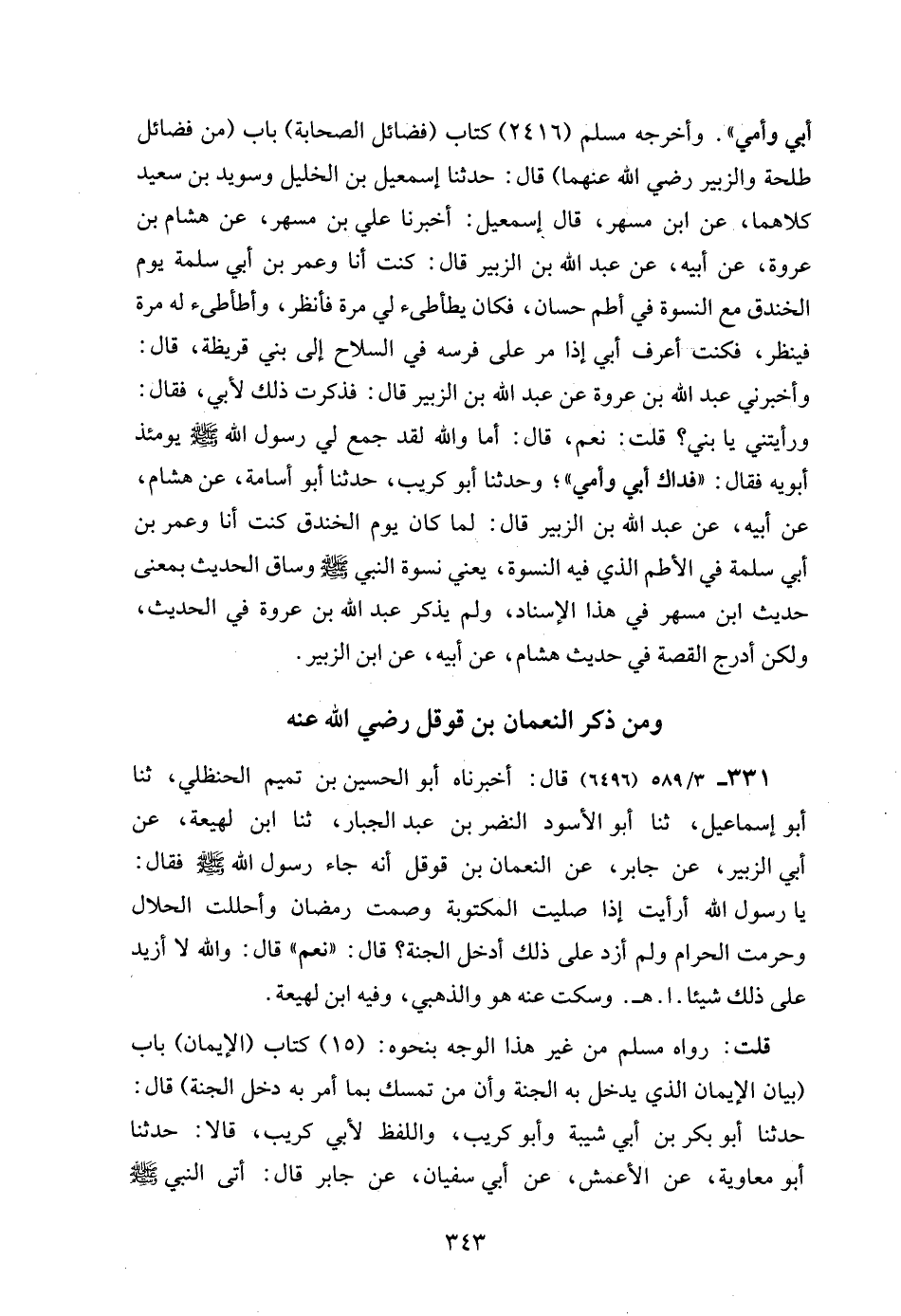 أبي وأمي". وأخرجه مسلم (2416) كتاب (فضائل الصحابة) باب (من فضائل طلحة والزبير رضي الله عنهما) قال: حدثنا إسمعيل بن الخليل وسويد بن سعيد كلاهما، عن ابن مسهر، قال إسمعيل: أخبرنا علي بن مسهر، عن هشام بن عروة، عن أبيه، عن عبد الله بن الزبير قال: كنت أنا وعمر بن أبي سلمة يوم الخندق مع النسوة في أطم حسان، فكان يطأطىء لي مرة فأنظر، وأطأطىء له مرة فينظر، فكنت أعرف أبي إذا مر على فرسه في السلاح إلى بني قريظة، قال: وأخبرني عبد الله بن عروة عن عبد الله بن الزبير قال: فذكرت ذلك لأبي، فقال: ورأيتني يا بني؟ قلت: نعم، قال: أما والله لقد جمع لي رسول الله - صلى الله عليه وسلم - يومئذ أبويه فقال: "فداك أبي وأمي"؛ وحدثنا أبو كريب، حدثنا أبو أسامة، عن هشام، عن أبيه، عن عبد الله بن الزبير قال: لما كان يوم الخندق كنت أنا وعمر بن أبي سلمة في الأطم الذي فيه النسوة، يعني نسوة النبي - صلى الله عليه وسلم - وساق الحديث بمعنى حديث ابن مسهر في هذا الإسناد، ولم يذكر عبد الله بن عروة في الحديث، ولكن أدرج القصة في حديث هشام، عن أبيه، عن ابن الزبير.