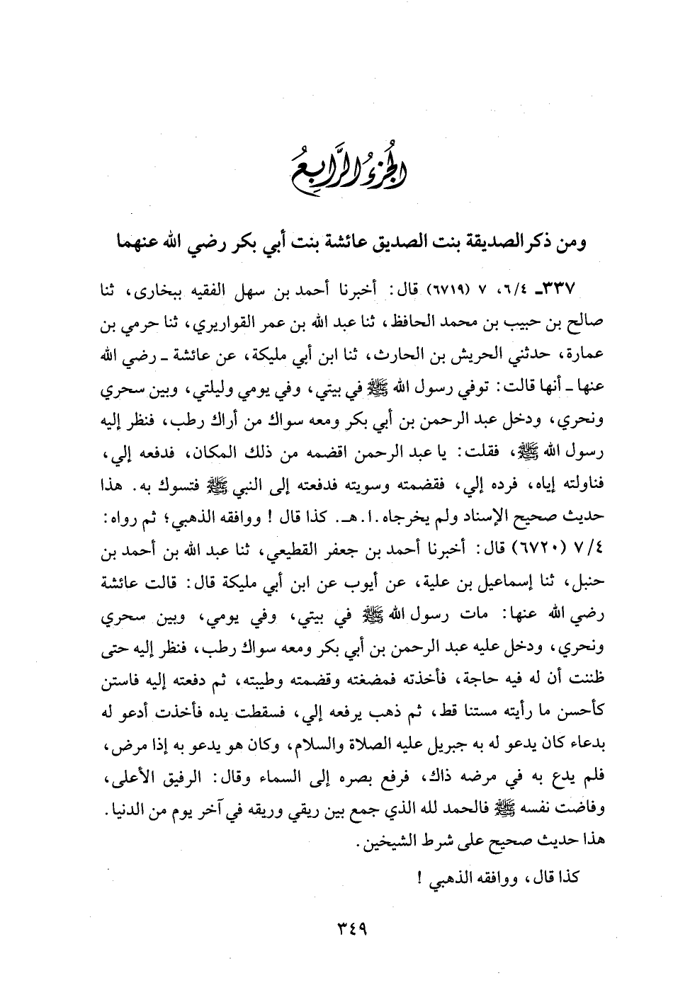 337 - 4/ 6، 7 (6719) قال: أخبرنا أحمد بن سهل الفقيه ببخارى، ثنا صالح بن حبيب بن محمد الحافظ، ثنا عبد الله بن عمر القواريري، ثنا حرمي بن عمارة، حدثني الحريش بن الحارث، ثنا ابن أبي مليكة، عن عائشة - رضي الله عنها - أنها قالت: توفي رسول الله - صلى الله عليه وسلم - في بيتي، وفي يومي وليلتي، وبين سحري ونحري، ودخل عبد الرحمن بن أبي بكر ومعه سواك من أراك رطب، فنظر إليه رسول الله - صلى الله عليه وسلم -، فقلت: يا عبد الرحمن اقضمه من ذلك المكان، فدفعه إلي، فناولته إياه، فرده إلي، فقضمته وسويته فدفعته إلى النبي - صلى الله عليه وسلم - فتسوك به. هذا حديث صحيح الإسناد ولم يخرجاه. ا. هـ. كذا قال! ووافقه الذهبي؛ ثم رواه: 4/ 7 (6720) قال: أخبرنا أحمد بن جعفر القطيعي، ثنا عبد الله بن أحمد بن حنبل، ثنا إسماعيل بن علية، عن أيوب عن ابن أبي مليكة قال: قالت عائشة رضي الله عنها: مات رسول الله - صلى الله عليه وسلم - في بيتي، وفي يومي، وبين سحري ونحري، ودخل عليه عبد الرحمن بن أبي بكر ومعه سواك رطب، فنظر إليه حتى ظننت أن له فيه حاجة، فأخذته فمضغته وقضمته وطيبته، ثم دفعته إليه فاستن كأحسن ما رأيته مستنا قط، ثم ذهب يرفعه إلي، فسقطت يده فأخذت أدعو له بدعاء كان يدعو له به جبريل عليه الصلاة والسلام، وكان هو يدعو به إذا مرض، فلم يدع به في مرضه ذاك، فرفع بصره إلى السماء وقال: الرفيق الأعلى، وفاضت نفسه - صلى الله عليه وسلم - فالحمد لله الذي جمع بين ريقي وريقه في آخر يوم من الدنيا. هذا حديث صحيح على شرط الشيخين.