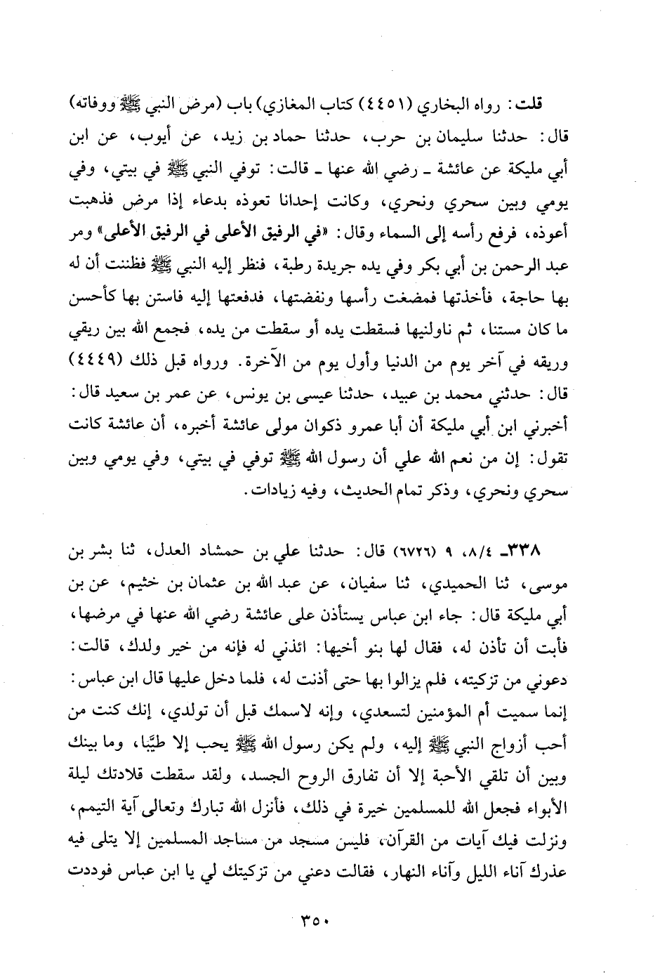 338 - 4/ 8، 9 (6726) قال: حدثنا علي بن حمشاد العدل، ثنا بشر بن موسى، ثنا الحميدي، ثنا سفيان، عن عبد الله بن عثمان بن خثيم، عن بن أبي مليكة قال: جاء ابن عباس يستأذن على عائشة رضي الله عنها في مرضها، فأبت أن تأذن له، فقال لها بنو أخيها: ائذني له فإنه من خير ولدك، قالت: دعوني من تزكيته، فلم يزالوا بها حتى أذنت له، فلما دخل عليها قال ابن عباس: إنما سميت أم المؤمنين لتسعدي، وإنه لاسمك قبل أن تولدي، إنك كنت من أحب أزواج النبي - صلى الله عليه وسلم - إليه، ولم يكن رسول الله - صلى الله عليه وسلم - يحب إلا طيَّبا، وما بينك وبين أن تلقي الأحبة إلا أن تفارق الروح الجسد، ولقد سقطت قلادتك ليلة الأبواء فجعل الله للمسلمين خيرة في ذلك، فأنزل الله تبارك وتعالى آية التيمم، ونزلت فيك آيات من القرآن، فليس مسجد من مساجد المسلمين إلا يتلى فيه عذرك آناء الليل وآناء النهار، فقالت دعني من تزكيتك لي يا ابن عباس فوددت