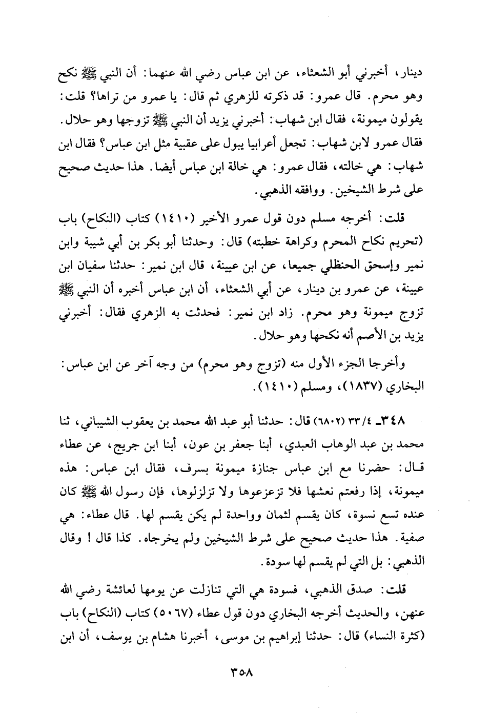 دينار، أخبرني أبو الشعثاء، عن ابن عباس رضي الله عنهما: أن النبي - صلى الله عليه وسلم - نكح وهو محرم. قال عمرو: قد ذكرته للزهري ثم قال: يا عمرو من تراها؟ قلت: يقولون ميمونة، فقال ابن شهاب: أخبرني يزيد أن النبي - صلى الله عليه وسلم - تزوجها وهو حلال. فقال عمرو لابن شهاب: تجعل أعرابيا يبول على عقبية مثل ابن عباس؟ فقال ابن شهاب: هي خالته، فقال عمرو: هي خالة ابن عباس أيضا. هذا حديث صحيح على شرط الشيخين. ووافقه الذهبي.