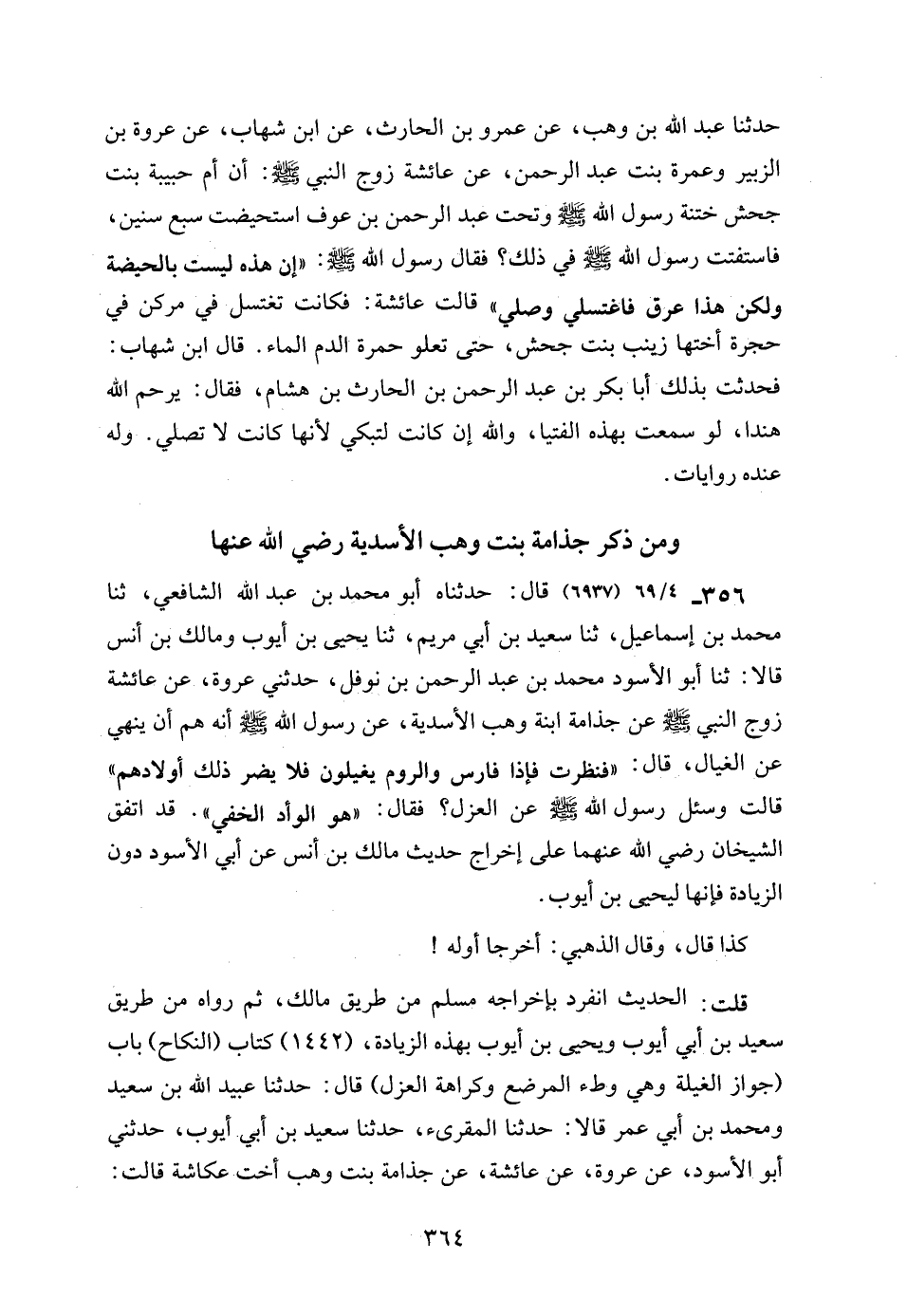 حدثنا عبد الله بن وهب، عن عمرو بن الحارث، عن ابن شهاب، عن عروة بن الزبير وعمرة بنت عبد الرحمن، عن عائشة زوج النبي - صلى الله عليه وسلم -: أن أم حبيبة بنت جحش ختنة رسول الله - صلى الله عليه وسلم - وتحت عبد الرحمن بن عوف استحيضت سبع سنين، فاستفتت رسول الله - صلى الله عليه وسلم - في ذلك؟ فقال رسول الله - صلى الله عليه وسلم -: "إن هذه ليست بالحيضة ولكن هذا عرق فاغتسلي وصلي" قالت عائشة: فكانت تغتسل في مركن في حجرة أختها زينب بنت جحش، حتى تعلو حمرة الدم الماء. قال ابن شهاب: فحدثت بذلك أبا بكر بن عبد الرحمن بن الحارث بن هشام، فقال: يرحم الله هندا، لو سمعت بهذه الفتيا، والله إن كانت لتبكي لأنها كانت لا تصلي. وله عنده روايات.