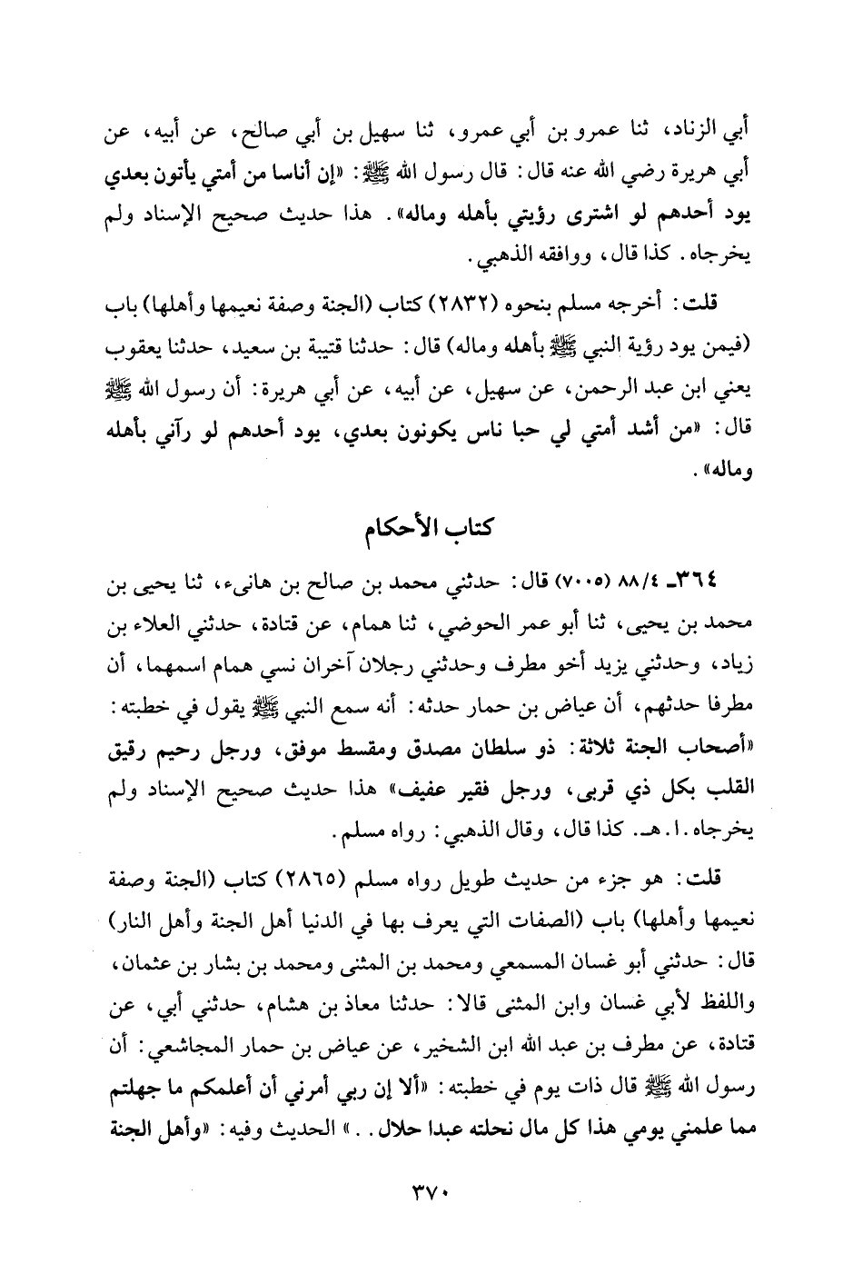 364 - 4/ 88 (7005) قال: حدثني محمد بن صالح بن هانىء، ثنا يحيى بن محمد بن يحيى، ثنا أبو عمر الحوضي، ثنا همام، عن قتادة، حدثني العلاء بن زياد، وحدثني يزيد أخو مطرف وحدثني رجلان آخران نسي همام اسمهما، أن مطرفا حدثهم، أن عياض بن حمار حدثه: أنه سمع النبي - صلى الله عليه وسلم - يقول في خطبته: "أصحاب الجنة ثلاثة: ذو سلطان مصدق ومقسط موفق، ورجل رحيم رقيق القلب بكل ذي قربى، ورجل فقير عفيف" هذا حديث صحيح الإسناد ولم يخرجاه. ا. هـ. كذا قال، وقال الذهبي: رواه مسلم.