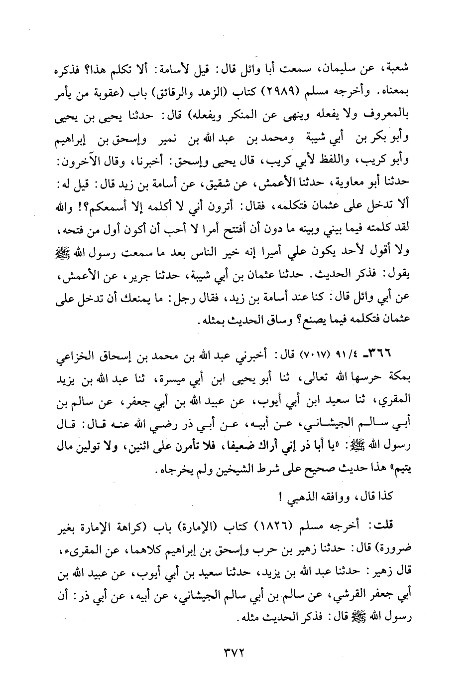 366 - 4/ 91 (7017) قال: أخبرني عبد الله بن محمد بن إسحاق الخزاعي بمكة حرسها الله تعالى، ثنا أبو يحيى ابن أبي ميسرة، ثنا عبد الله بن يزيد المقري، ثنا سعيد ابن أبي أيوب، عن عبيد الله بن أبي جعفر، عن سالم بن أبي سالم الجيشاني، عن أبيه، عن أبي ذر رضي الله عنه قال: قال رسول الله - صلى الله عليه وسلم -: "يا أبا ذر إني أراك ضعيفا، فلا تأمرن على اثنين، ولا تولين مال يتيم" هذا حديث صحيح على شرط الشيخين ولم يخرجاه.