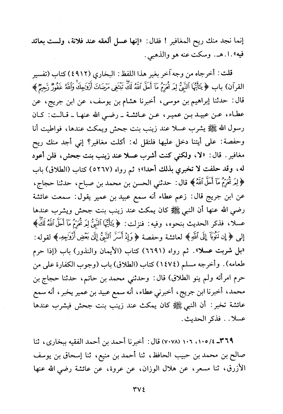 قلت: أخرجاه من وجه آخر بغير هذا اللفظ: البخاري (4912) كتاب (تفسير القرآن) باب {يَاأَيُّهَا النَّبِيُّ لِمَ تُحَرِّمُ مَا أَحَلَّ اللَّهُ لَكَ تَبْتَغِي مَرْضَاتَ أَزْوَاجِكَ وَاللَّهُ غَفُورٌ رَحِيمٌ} قال: حدثنا إبراهيم بن موسى، أخبرنا هشام بن يوسف، عن ابن جريج، عن عطاء، عن عبيد بن عمير، عن عائشة - رضي الله عنها - قالت: كان رسول الله - صلى الله عليه وسلم - يشرب عسلا عند زينب بنت جحش ويمكث عندها، فواطيت أنا وحفصة: على أيتنا دخل عليها فلتقل له: أكلت مغافير؟ إني أجد منك ريح مغافير. قال: "لا، ولكني كنت أشرب عسلا عند زينب بنت جحش، فلن أعود له، وقد حلفت لا تخبري بذلك أحدا"؛ ثم رواه (5267) كتاب (الطلاق) باب {لِمَ تُحَرِّمُ مَا أَحَلَّ اللَّهُ} قال: حدثني الحسن بن محمد بن صباح، حدثنا حجاج، عن ابن جريج قال: زعم عطاء أنه سمع عبيد بن عمير يقول: سمعت عائشة رضي الله عنها أن النبي - صلى الله عليه وسلم - كان يمكث عند زينب بنت جحش ويشرب عندها عسلا، فذكر الحديث بنحوه، وفيه: فنزلت: {يَاأَيُّهَا النَّبِيُّ لِمَ تُحَرِّمُ مَا أَحَلَّ اللَّهُ لَكَ} إلى {إِنْ تَتُوبَا إِلَى اللَّهِ} لعائشة وحفصة {وَإِذْ أَسَرَّ النَّبِيُّ إِلَى بَعْضِ أَزْوَاجِهِ} لقوله: "بل شربت عسلا". ثم رواه (6691) كتاب (الأيمان والنذور) باب (إذا حرم طعامه). وأخرجه مسلم (1474) كتاب (الطلاق) باب (وجوب الكفارة على من حرم امرأته ولم ينو الطلاق) قال: وحدثني محمد بن حاتم، حدثنا حجاج بن محمد، أخبرنا ابن جريج، أخبرني عطاء، أنه سمع عبيد بن عمير يخبر، أنه سمع عائشة تخبر: أن النبي - صلى الله عليه وسلم - كان يمكث عند زينب بنت جحش فيشرب عندها عسلا .. فذكر الحديث.