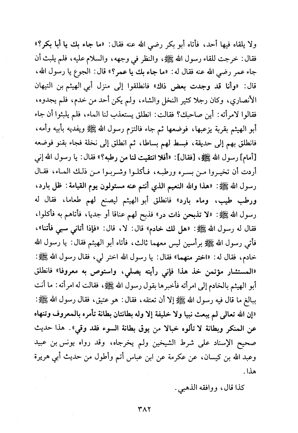 ولا يلقاه فيها أحد، فأتاه أبو بكر رضي الله عنه فقال: "ما جاء بك يا أبا بكر؟ " فقال: خرجت للقاء رسول الله - صلى الله عليه وسلم -، والنظر في وجهه، والسلام عليه، فلم يلبث أن جاء عمر رضي الله عنه فقال له: "ما جاء بك يا عمر؟ " قال: الجوع يا رسول الله، قال: "وأنا قد وجدت بعض ذاك" فانطلقوا إلى منزل أبي الهيثم بن التيهان الأنصاري، وكان رجلا كثير النخل والشاء، ولم يكن أحد من خدم، فلم يجدوه، فقالوا لامرأته: أين صاحبك؟ فقالت: انطلق يستعذب لنا الماء، فلم يلبثوا أن جاء أبو الهيثم بقربة يزعبها، فوضعها ثم جاء فالتزم رسول الله - صلى الله عليه وسلم - ويفديه بأبيه وأمه، فانطلق بهم إلى حديقة، فبسط لهم بساطا، ثم انطلق إلى نخلة فجاء بقنو فوضعه [أمام] رسول الله - صلى الله عليه وسلم -، [فقال]: "أفلا انتقيت لنا من رطبه؟ " فقال: يا رسول الله إني أردت أن تخيروا من بسره ورطبه، فأكلوا وشربوا من ذلك الماء، فقال رسول الله - صلى الله عليه وسلم -: "هذا والله النعيم الذي أنتم عنه مسئولون يوم القيامة: ظل بارد، ورطب طيب، وماء بارد" فانطلق أبو الهيثم ليصنع لهم طعاما، فقال له رسول الله - صلى الله عليه وسلم -: "لا تذبحن ذات در" فذبح لهم عناقا أو جديا، فأتاهم به فأكلوا، فقال له رسول الله - صلى الله عليه وسلم -: "هل لك خادم" قال: لا، قال: "فإذا أتاني سبي فأتنا"، فأتي رسول الله - صلى الله عليه وسلم - برأسين ليس معهما ثالث، فأتاه أبو الهيثم فقال: يا رسول الله خادم، فقال له: "اختر منهما" فقال: يا رسول الله اختر لي، فقال رسول الله - صلى الله عليه وسلم -: "المستشار مؤتمن خذ هذا فإني رأيته يصلي، واستوص به معروفا" فانطلق أبو الهيثم بالخادم إلى امرأته فأخبرها بقول رسول الله - صلى الله عليه وسلم -، فقالت له امرأته: ما أنت ببالغ ما قال فيه رسول الله - صلى الله عليه وسلم - إلا أن تعتقه، فقال: هو عتيق، فقال رسول الله - صلى الله عليه وسلم -: "إن الله تعالى لم يبعث نبيا ولا خليفة إلا وله بطانتان بطانة تأمره بالمعروف وتنهاه عن المنكر وبطانة لا تألوه خبالا من يوق بطانة السوء فقد وقي". هذا حديث صحيح الإسناد على شرط الشيخين ولم يخرجاه، وقد رواه يونس بن عبيد وعبد الله بن كيسان، عن عكرمة عن ابن عباس أتم وأطول من حديث أبي هريرة هذا.