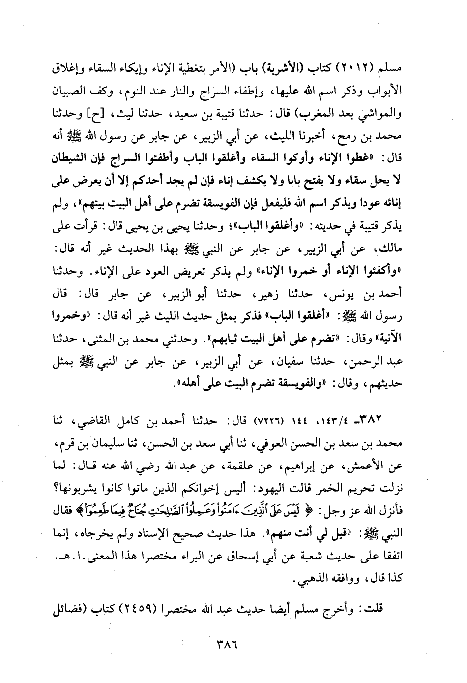 مسلم (2012) كتاب (الأشربة) باب (الأمر بتغطية الإناء وإيكاء السقاء وإغلاق الأبواب وذكر اسم الله عليها، وإطفاء السراج والنار عند النوم، وكف الصبيان والمواشي بعد المغرب) قال: حدثنا قتيبة بن سعيد، حدثنا ليث، [ح] وحدثنا محمد بن رمح، أخبرنا الليث، عن أبي الزبير، عن جابر عن رسول الله - صلى الله عليه وسلم - أنه قال: "غطوا الإناء وأوكوا السقاء وأغلقوا الباب وأطفئوا السراج فإن الشيطان لا يحل سقاء ولا يفتح بابا ولا يكشف إناء فإن لم يجد أحدكم إلا أن يعرض على إنائه عودا ويذكر اسم الله فليفعل فإن الفويسقة تضرم على أهل البيت بيتهم"، ولم يذكر قتيبة في حديثه: "وأغلقوا الباب"؛ وحدثنا يحيى بن يحيى قال: قرأت على مالك، عن أبي الزبير، عن جابر عن النبي - صلى الله عليه وسلم - بهذا الحديث غير أنه قال: "وأكفئوا الإناء أو خمروا الإناء" ولم يذكر تعريض العود على الإناء. وحدثنا أحمد بن يونس، حدثنا زهير، حدثنا أبو الزبير، عن جابر قال: قال رسول الله - صلى الله عليه وسلم -: "أغلقوا الباب" فذكر بمثل حديث الليث غير أنه قال: "وخمروا الآنية" وقال: "تضرم على أهل البيت ثيابهم". وحدثني محمد بن المثنى، حدثنا عبد الرحمن، حدثنا سفيان، عن أبي الزبير، عن جابر عن النبي - صلى الله عليه وسلم - بمثل حديثهم، وقال: "والفويسقة تضرم البيت على أهله".