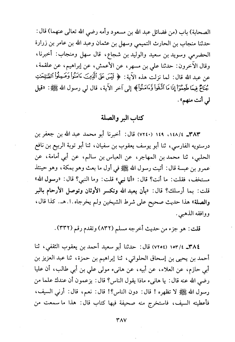 383 - 4/ 148، 149 (7240) قال: أخبرنا أبو محمد عبد الله بن جعفر بن درستويه الفارسي، ثنا أبو يوسف يعقوب بن سفيان، ثنا أبو توبة الربيع بن نافع الحلبي، ثنا محمد بن المهاجر، عن العباس بن سالم، عن أبي أمامة، عن عمرو بن عبسة قال: أتيت رسول الله - صلى الله عليه وسلم - في أول ما بعث وهو بمكة، وهو حينئذ مستخف، فقلت: ما أنت؟ قال: "أنا نبي" قلت: وما النبي؟ قال: "رسول الله" قلت: بما أرسلك؟ قال: "بأن يعبد الله وتكسر الأوثان وتوصل الأرحام بالبر والصلة" هذا حديث صحيح على شرط الشيخين ولم يخرجاه. ا. هـ. كذا قال، ووافقه الذهبي.