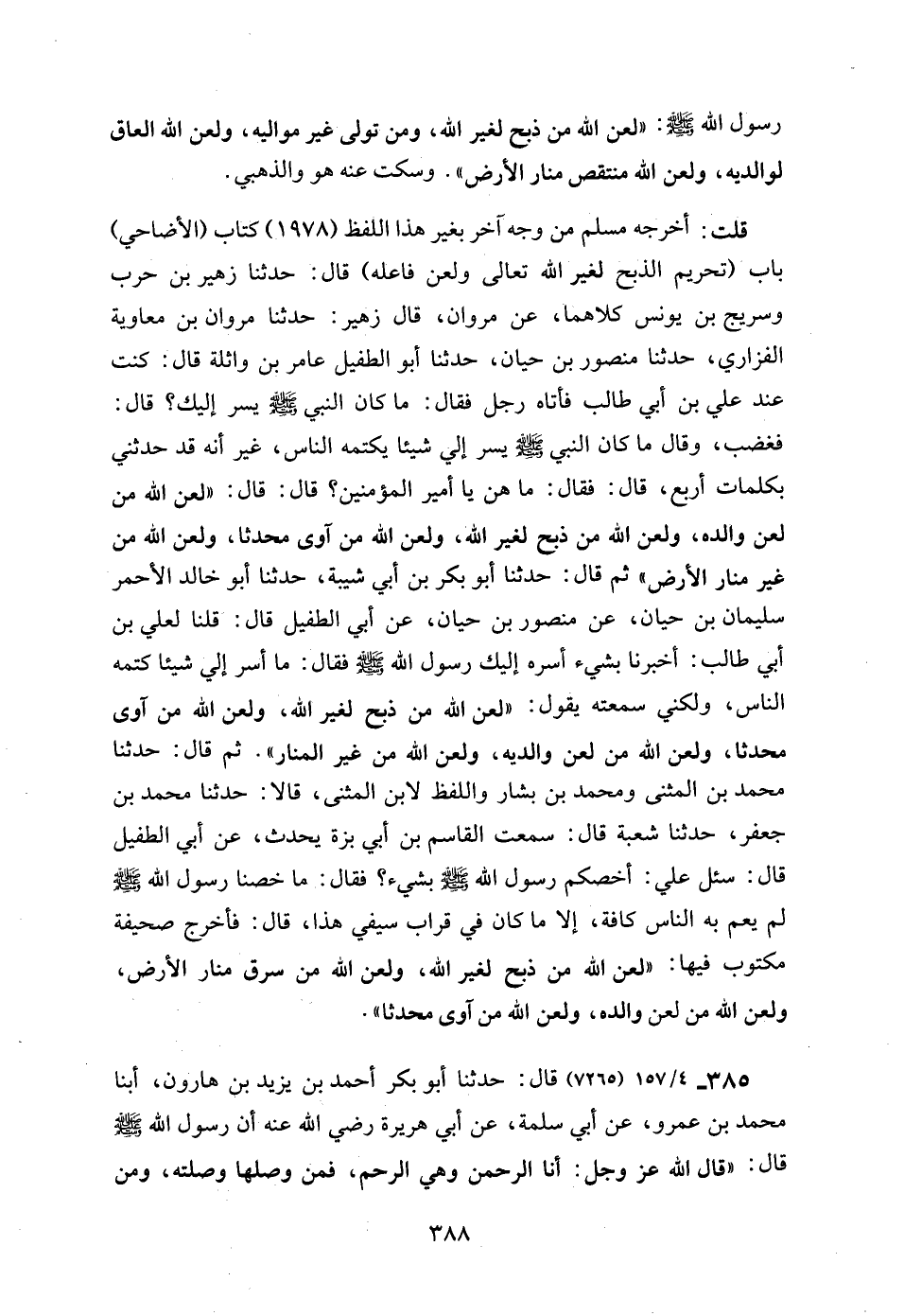 قلت: أخرجه مسلم من وجه آخر بغير هذا اللفظ (1978) كتاب (الأضاحي) باب (تحريم الذبح لغير الله تعالى ولعن فاعله) قال: حدثنا زهير بن حرب وسريج بن يونس كلاهما، عن مروان، قال زهير: حدثنا مروان بن معاوية الفزاري، حدثنا منصور بن حيان، حدثنا أبو الطفيل عامر بن واثلة قال: كنت عند علي بن أبي طالب فأتاه رجل فقال: ما كان النبي - صلى الله عليه وسلم - يسر إليك؟ قال: فغضب، وقال ما كان النبي - صلى الله عليه وسلم - يسر إلي شيئا يكتمه الناس، غير أنه قد حدثني بكلمات أربع، قال: فقال: ما هن يا أمير المؤمنين؟ قال: قال: "لعن الله من لعن والده، ولعن الله من ذبح لغير الله، ولعن الله من آوى محدثا، ولعن الله من غير منار الأرض" ثم قال: حدثنا أبو بكر بن أبي شيبة، حدثنا أبو خالد الأحمر سليمان بن حيان، عن منصور بن حيان، عن أبي الطفيل قال: قلنا لعلي بن أبي طالب: أخبرنا بشيء أسره إليك رسول الله - صلى الله عليه وسلم - فقال: ما أسر إلي شيئا كتمه الناس، ولكني سمعته يقول: "لعن الله من ذبح لغير الله، ولعن الله من آوى محدثا، ولعن الله من لعن والديه، ولعن الله من غير المنار". ثم قال: حدثنا محمد بن المثنى ومحمد بن بشار واللفظ لابن المثنى، قالا: حدثنا محمد بن جعفر، حدثنا شعبة قال: سمعت القاسم بن أبي بزة يحدث، عن أبي الطفيل قال: سئل علي: أخصكم رسول الله - صلى الله عليه وسلم - بشيء؟ فقال: ما خصنا رسول الله - صلى الله عليه وسلم - لم يعم به الناس كافة، إلا ما كان في قراب سيفي هذا، قال: فأخرج صحيفة مكتوب فيها: "لعن الله من ذبح لغير الله، ولعن الله من سرق منار الأرض، ولعن الله من لعن والده، ولعن الله من آوى محدثا".