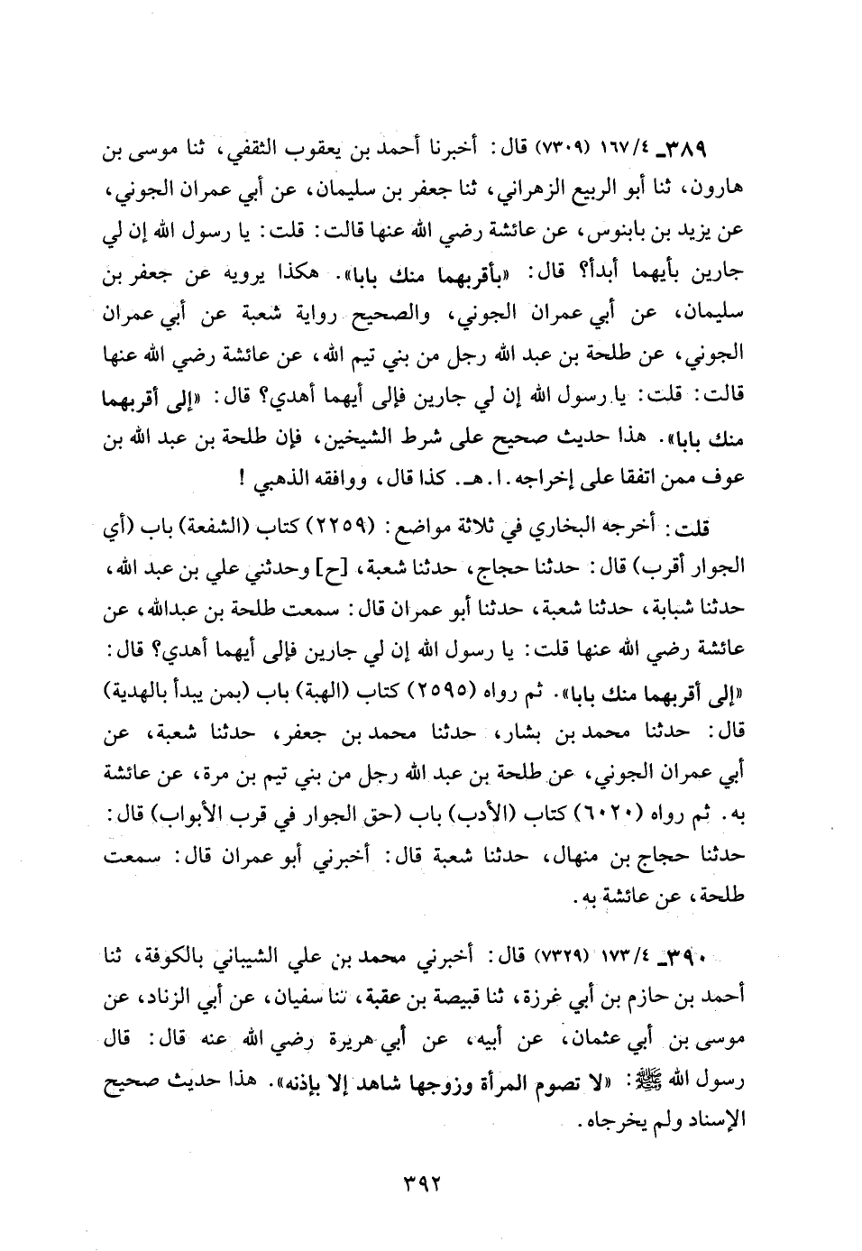 389 - 4/ 167 (7309) قال: أخبرنا أحمد بن يعقوب الثقفي، ثنا موسى بن هارون، ثنا أبو الربيع الزهراني، ثنا جعفر بن سليمان، عن أبي عمران الجوني، عن يزيد بن بابنوس، عن عائشة رضي الله عنها قالت: قلت: يا رسول الله إن لي جارين بأيهما أبدأ؟ قال: "بأقربهما منك بابا". هكذا يرويه عن جعفر بن سليمان، عن أبي عمران الجوني، والصحيح رواية شعبة عن أبي عمران الجوني، عن طلحة بن عبد الله رجل من بني تيم الله، عن عائشة رضي الله عنها قالت: قلت: يا رسول الله إن لي جارين فإلى أيهما أهدي؟ قال: "إلى أقربهما منك بابا". هذا حديث صحيح على شرط الشيخين، فإن طلحة بن عبد الله بن عوف ممن اتفقا على إخراجه. ا. هـ. كذا قال، ووافقه الذهبي!